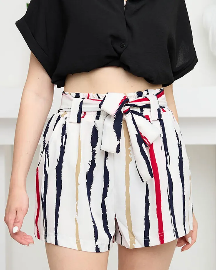 - Bardzo wygodne i eleganckie krótkie spodenki wykonane z miękkiej, przyjemnej tkaniny. Model z elastyczną gumką i dodatkowym paskiem w pasie. Zdobi je wzór w paski! UWAGA: dokładność pomiaru (+/-) 1 cm. Wymiary mierzone na płasko.