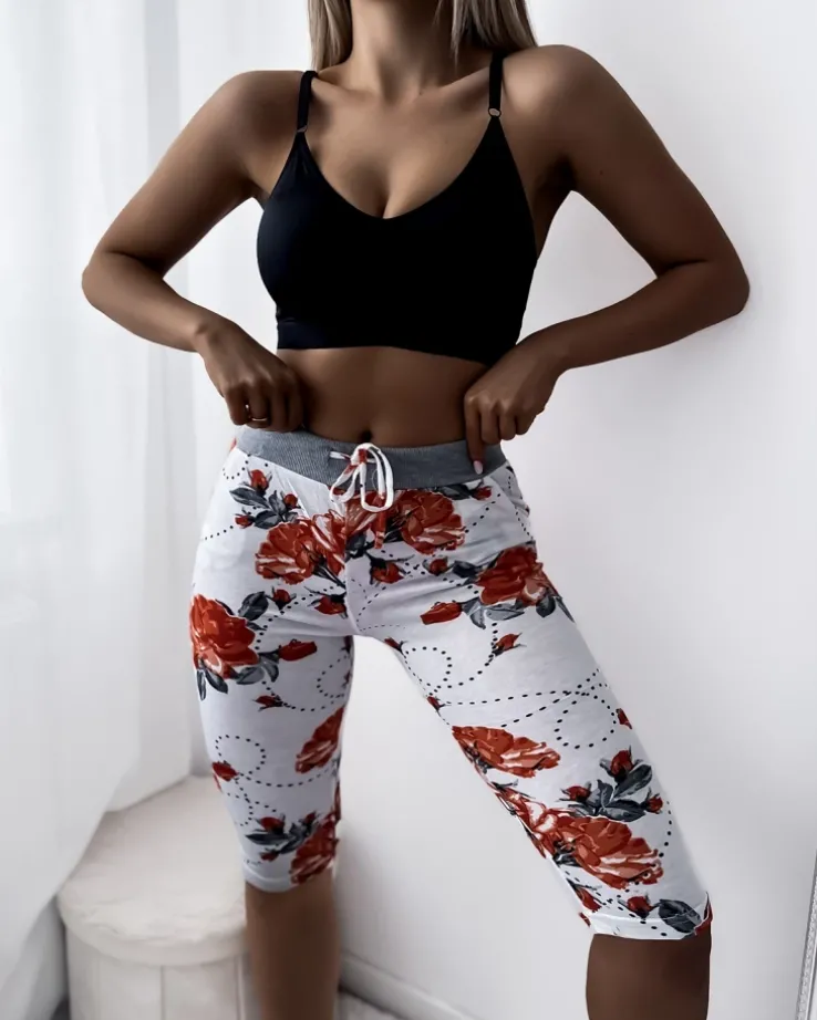 - Komfortowe damskie materiałowe spodenki w kwiaty o długości 3/4, wykonane z tkaniny bawełnianej. Model posiada średni stan, gumkę w pasie oraz 2 wsuwane kieszenie. UWAGA: Dokładność pomiaru (+/-) 1 cm.