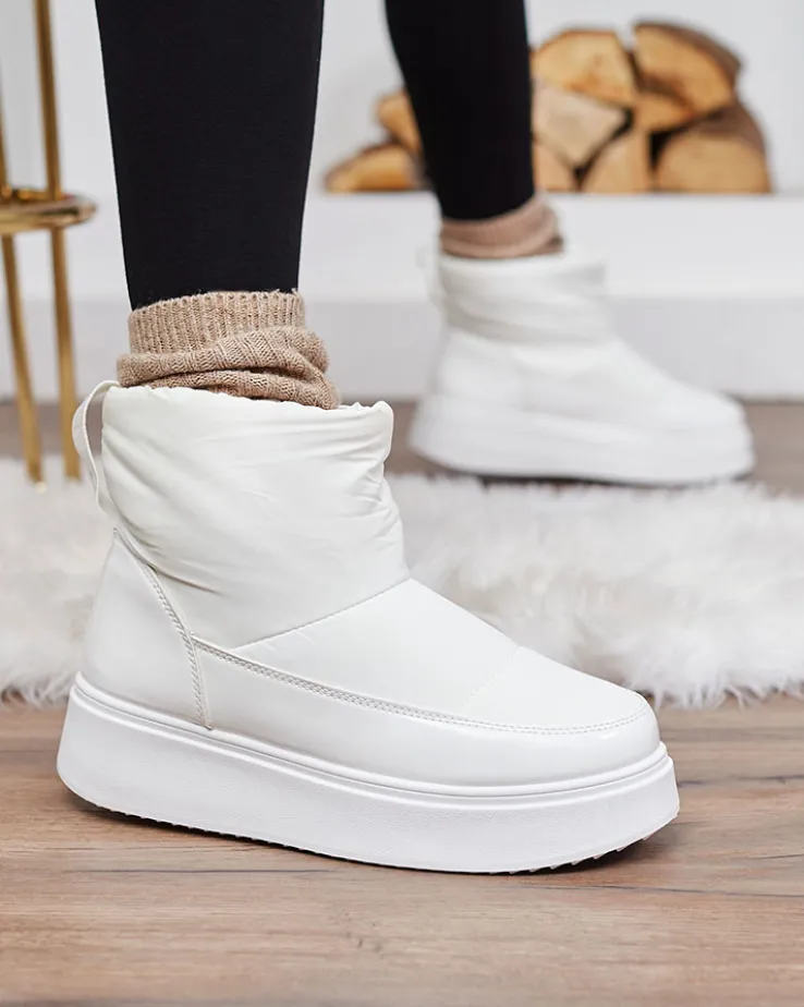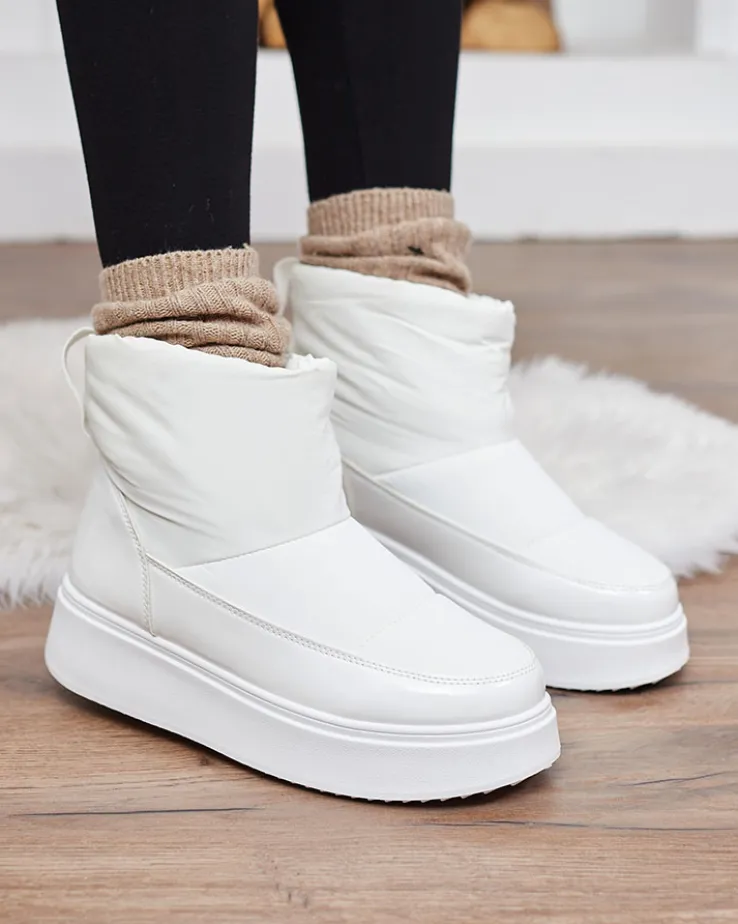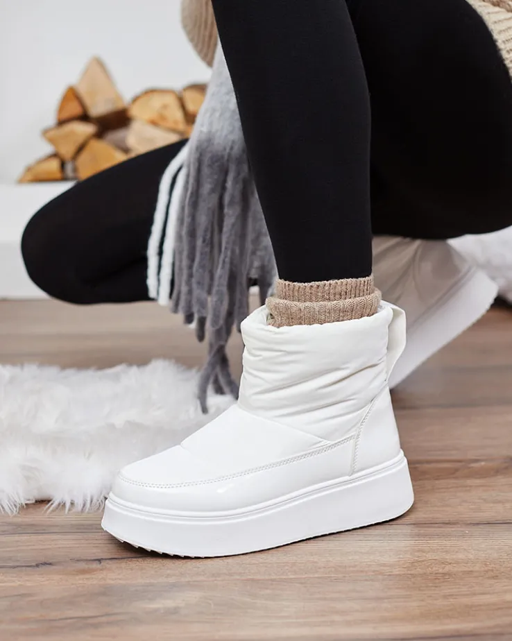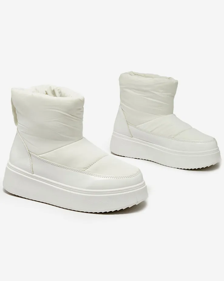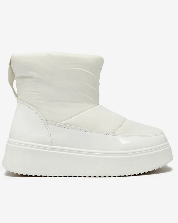- Ponadczasowe damskie obuwie typu śniegowce. Model z cholewką wykonaną z materiału a’la cerata i wstawkami z lakierowanej eko skóry. W środku ocieplenie w formie futerka, obuwie wsuwane. Idealne na chłodniejszą porę roku!