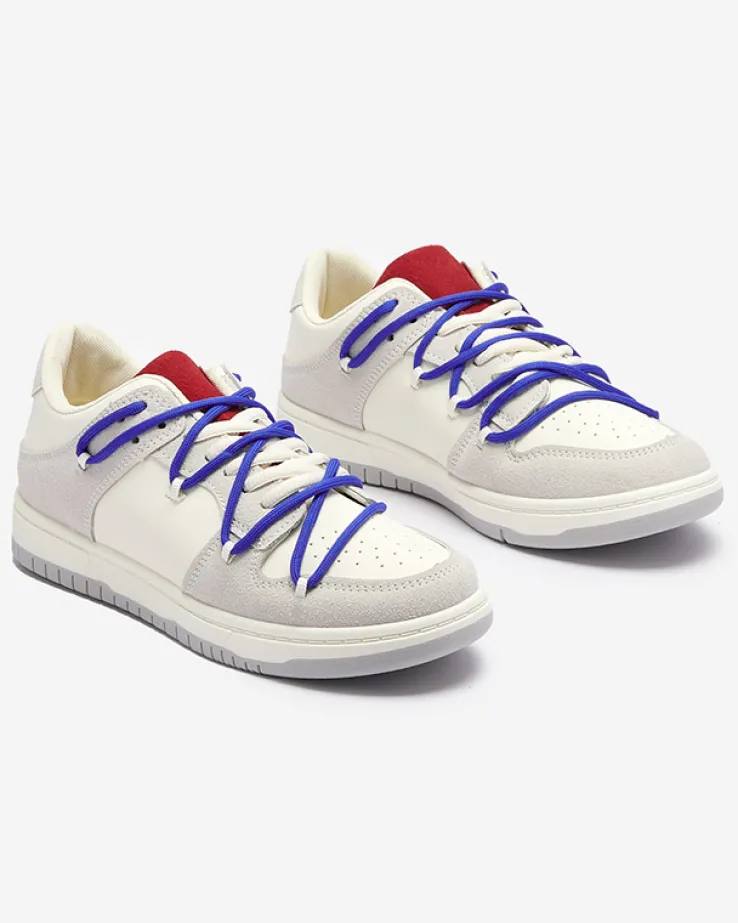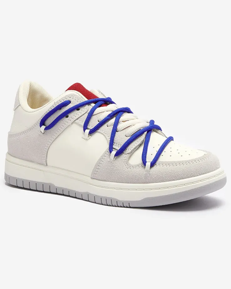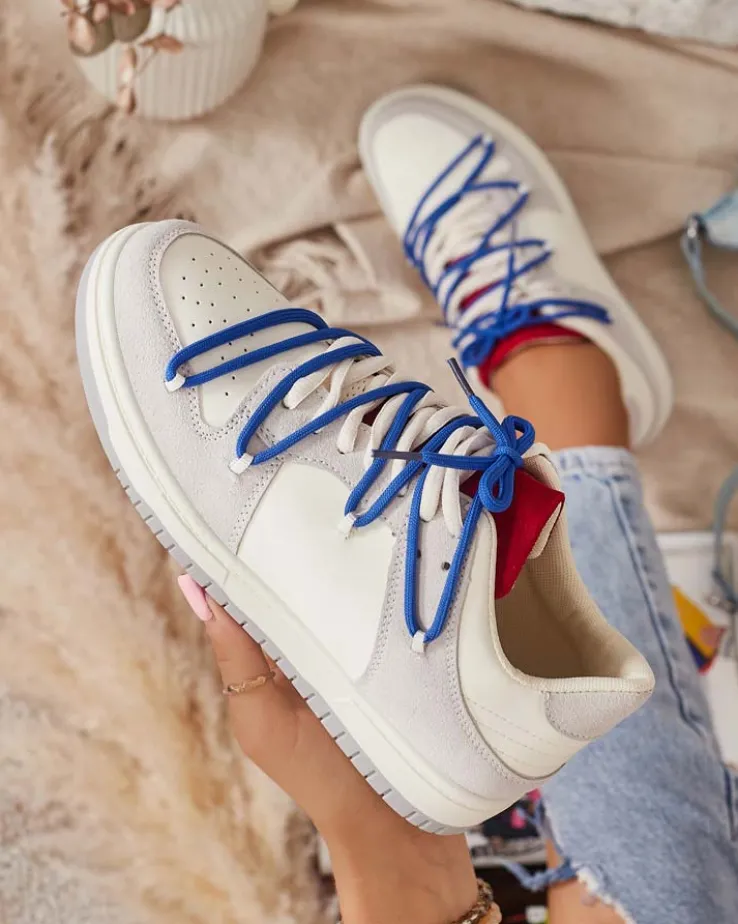 Royalfashion Biało – szare sportowe sneakersy damskie z granatowymi sznurówkami Olierinc