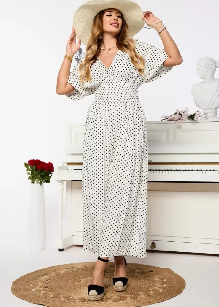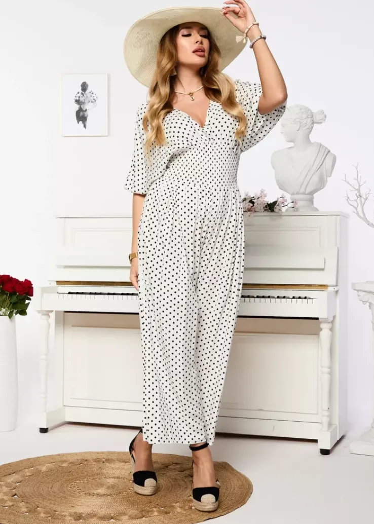 - Przepiękny kombinezon damski w groszki, z krótkimi rękawami. Model z kopertowym dekoltem, wiązaniem z tyłu oraz szeroką gumą w talii. Produkt posiada szerokie, długie nogawki. UWAGA: Dokładność pomiaru (+/-) 1 cm.