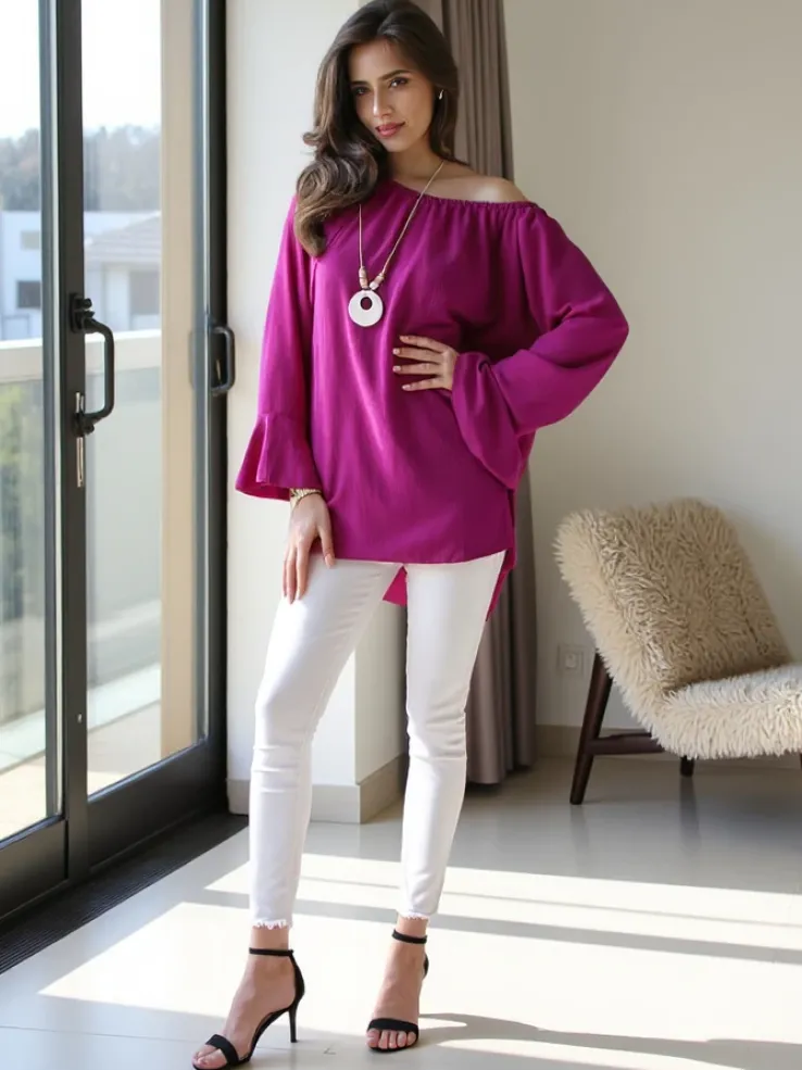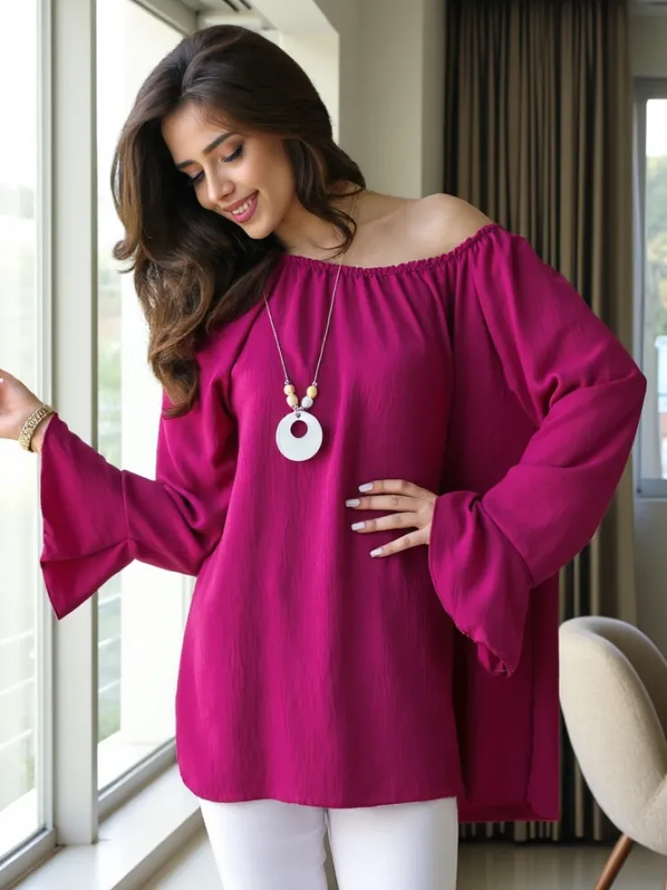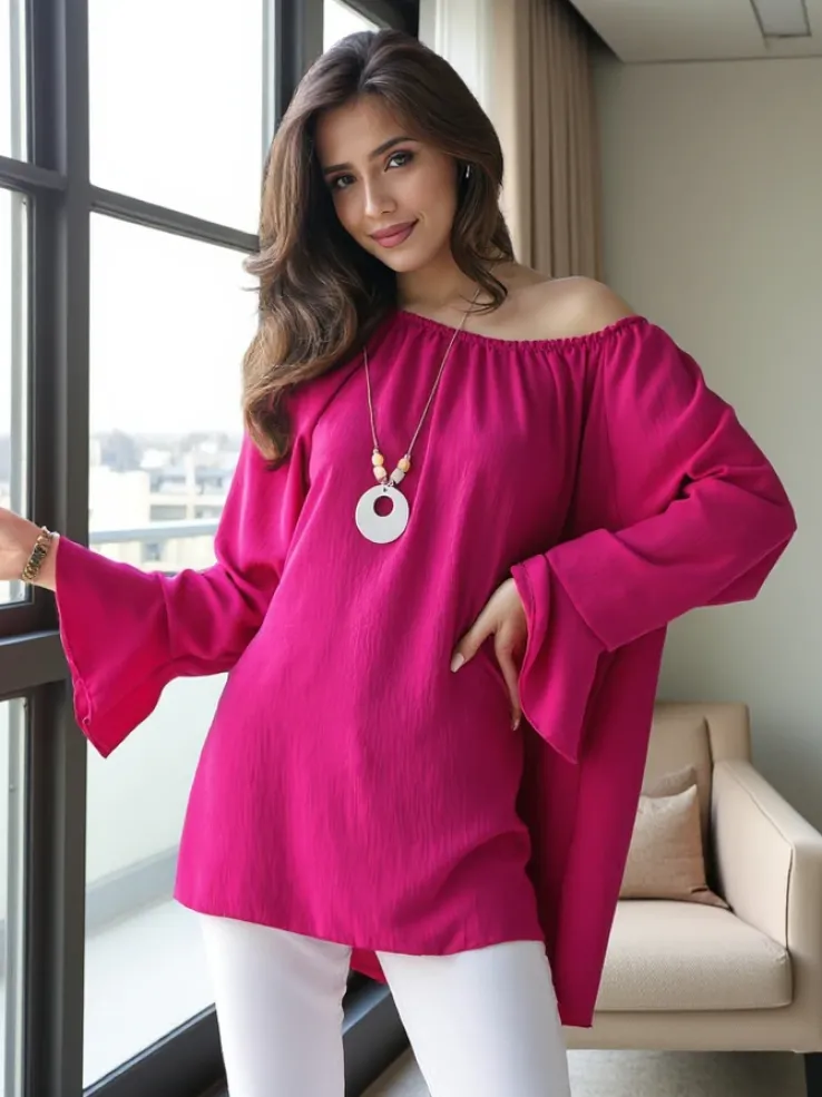 - Wyjątkowa damska bluzka a’la hiszpanka wykonana z miękkiego, przyjemnego materiału. Posiada okrągły dekolt z gumką oraz rękawy zdobione falbankami. Dodatkowo naszyjnik w zestawie. Idealna na co dzień jak i specjalne okazje!