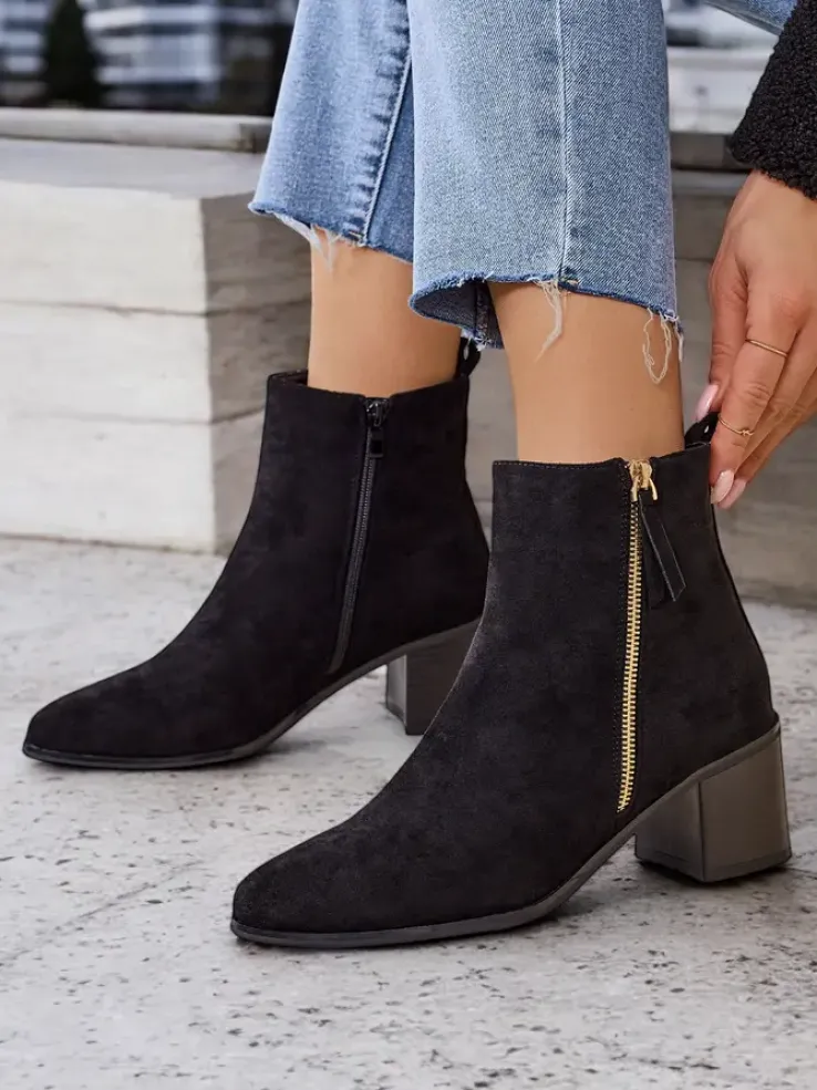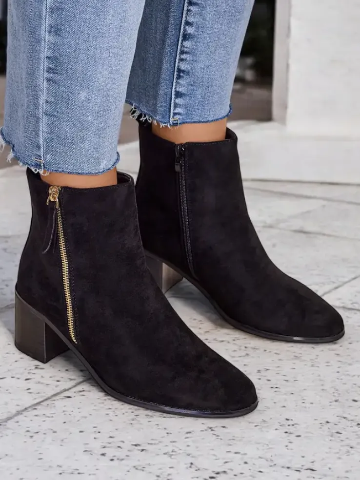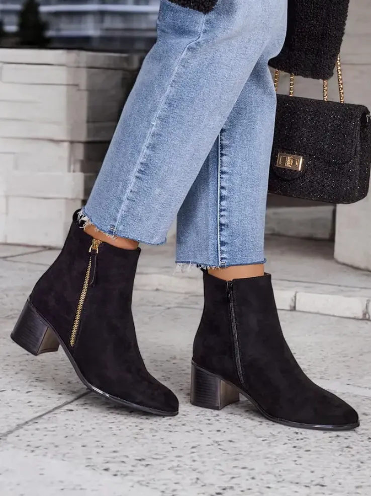 - Rewelacyjne botki damskie na niskim obcasie, wykonane są z eko skóry zamszowej. Wnętrze wykonane z delikatnego futerka. Model zapinany na suwak. Idealne do jesiennych kreacji!