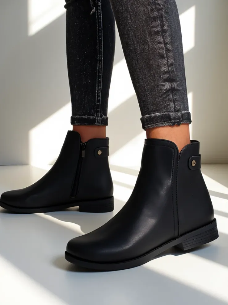 - Rewelacyjne botki damskie na płaskim obcasie, wykonane są z eko skóry. Wnętrze z delikatnym futerkiem gwarantuje komfort i ciepło nawet w chłodniejsze dni. Model zapinany na suwak.