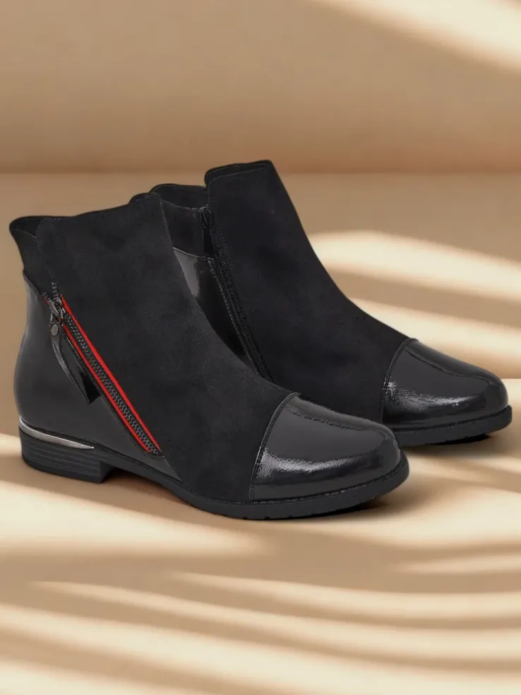 - Rewelacyjne botki damskie na płaskim obcasie, wykonane są z połączenia eko skóry matowej z elementami eko skóry lakierowanej. Wnętrze wykonane z futerka. Model zapinany na suwak. Idealne do jesiennych kreacji!