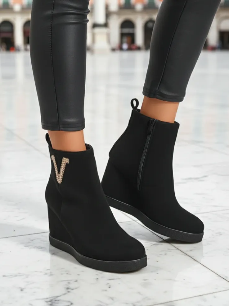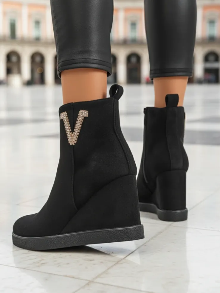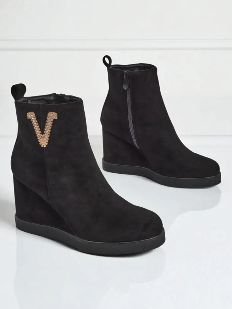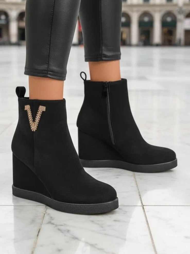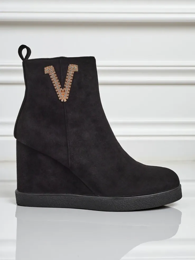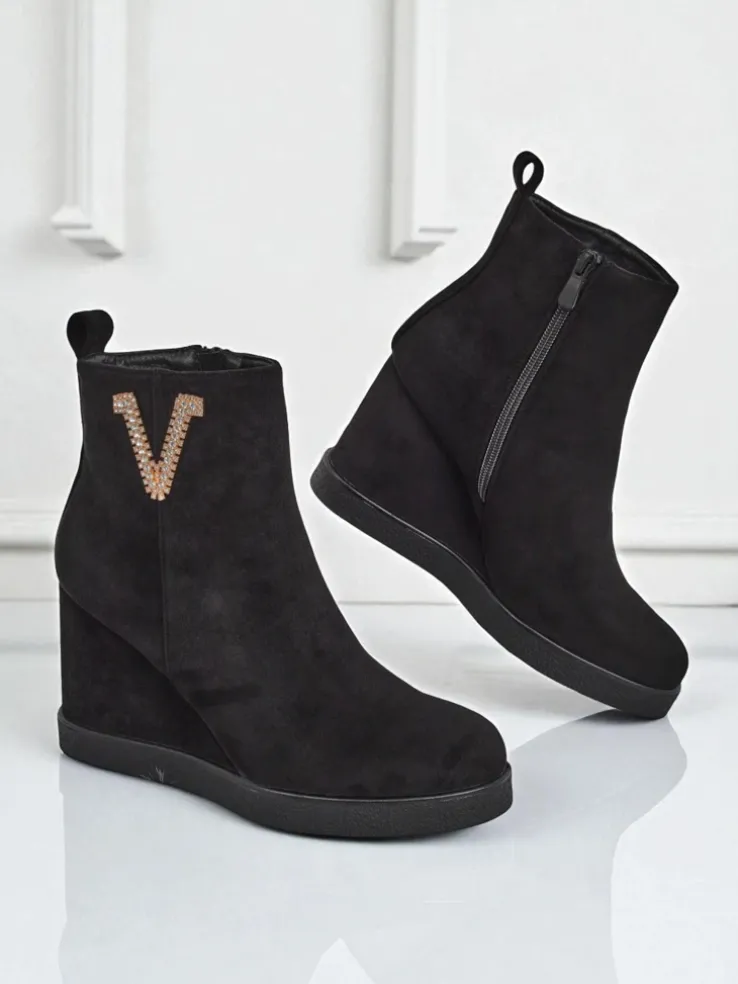 - Eleganckie damskie botki na koturnie, wykonane z eko-zamszu. Obuwie wypełnione od środka futerkiem. Idealny wybór na jesień!