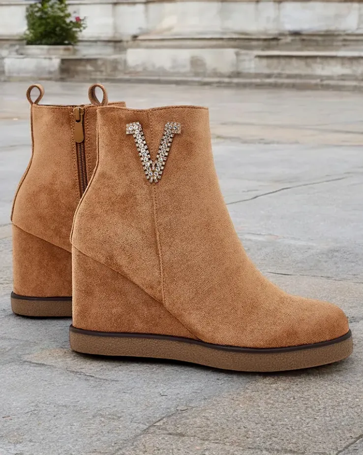 - Eleganckie damskie botki na koturnie, wykonane z eko-zamszu. Obuwie wypełnione od środka futerkiem. Idealny wybór na jesień!