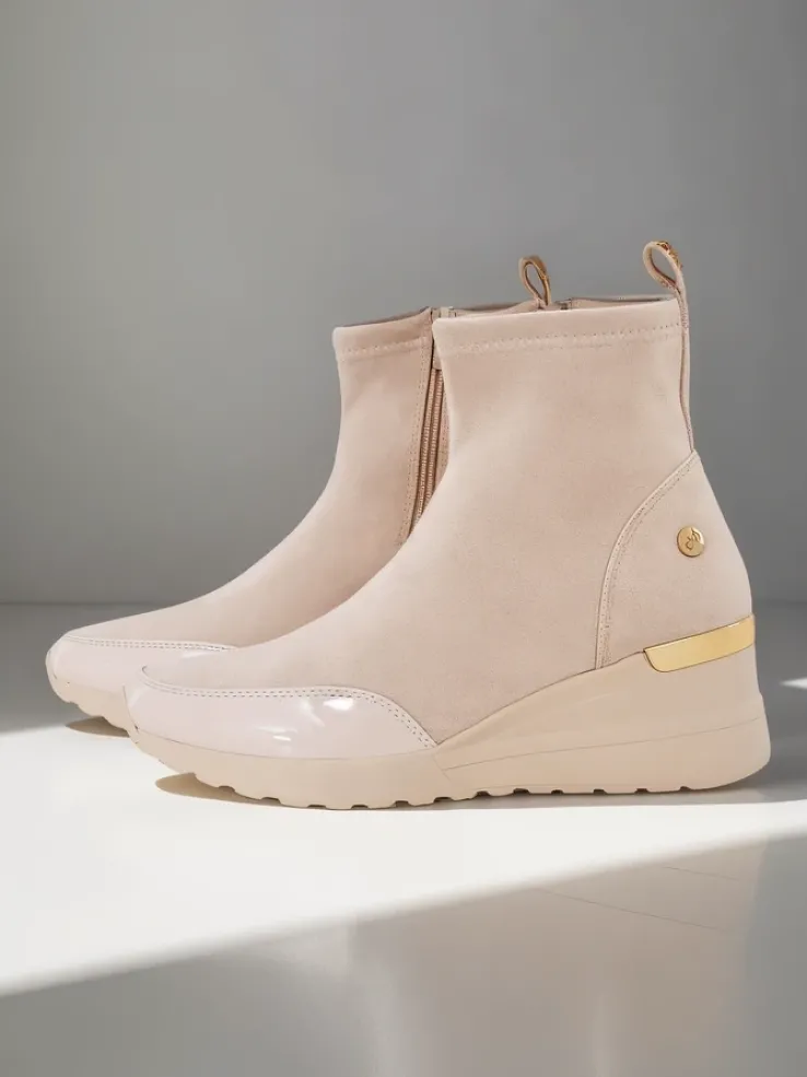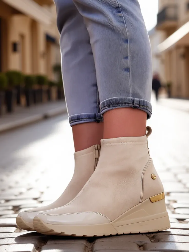 - Stylowe botki wykonane ze skóry ekologicznej zamszowej. Model wsuwany, na koturnie. W środku delikatne ocieplenie. Idealne do wielu kobiecych stylizacji.