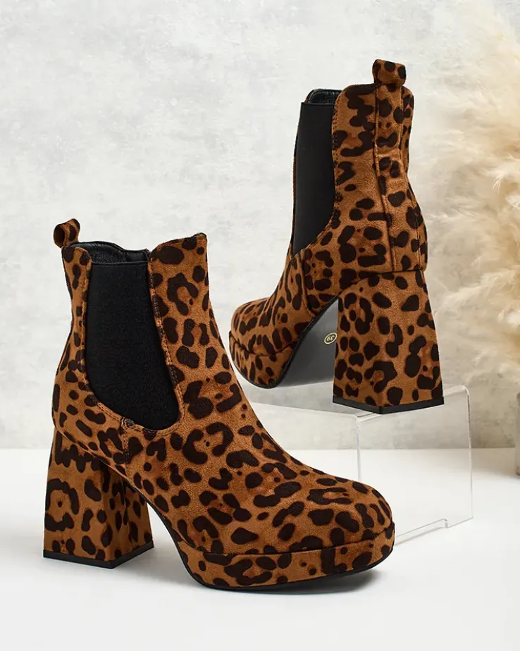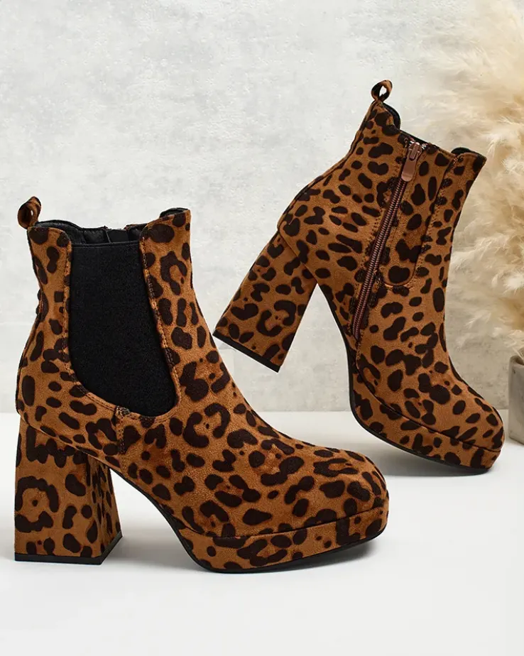 - Botki na słupku- styl i wygoda w jednym. Model zapinany na zamek. Całość wykonana ze skóry ekologicznej zamszowej i eko skórzanej wkładki. Model zdobiony wzorem w panterkę. Ten model doda Ci pewności siebie!