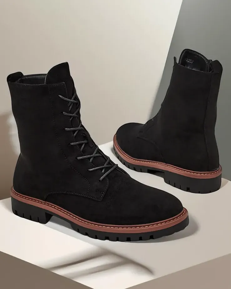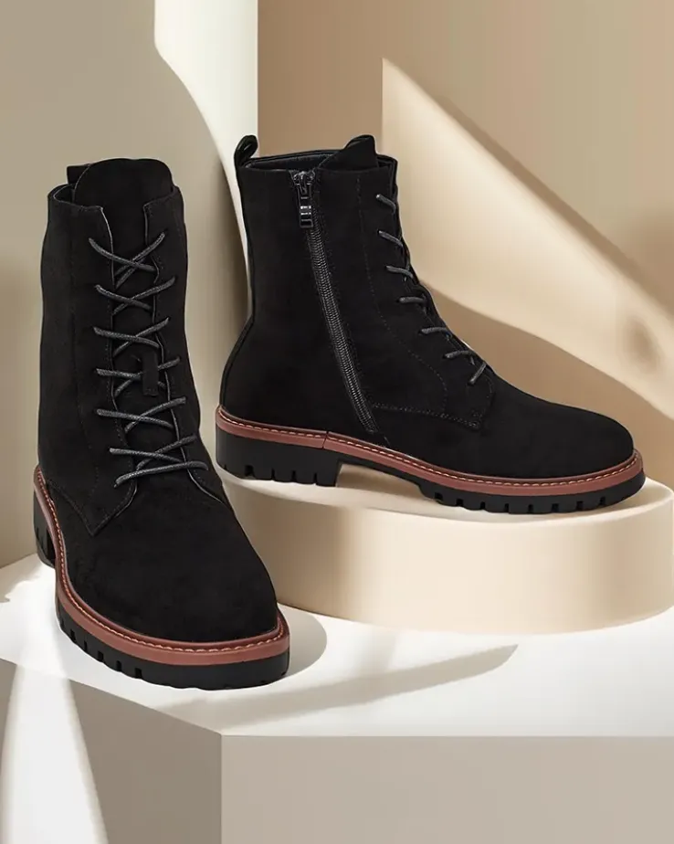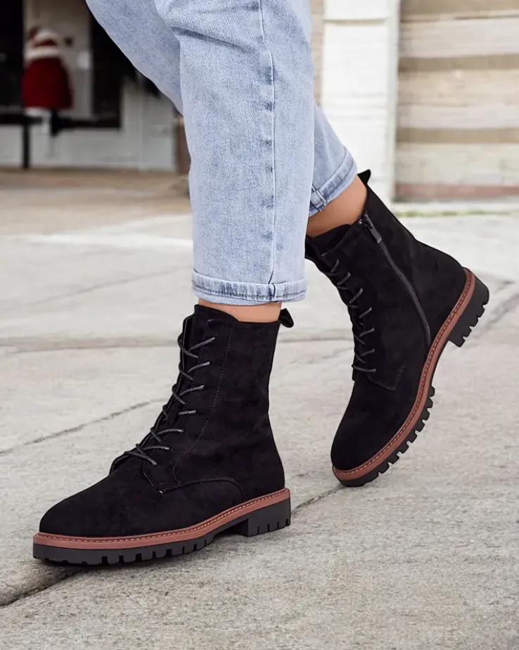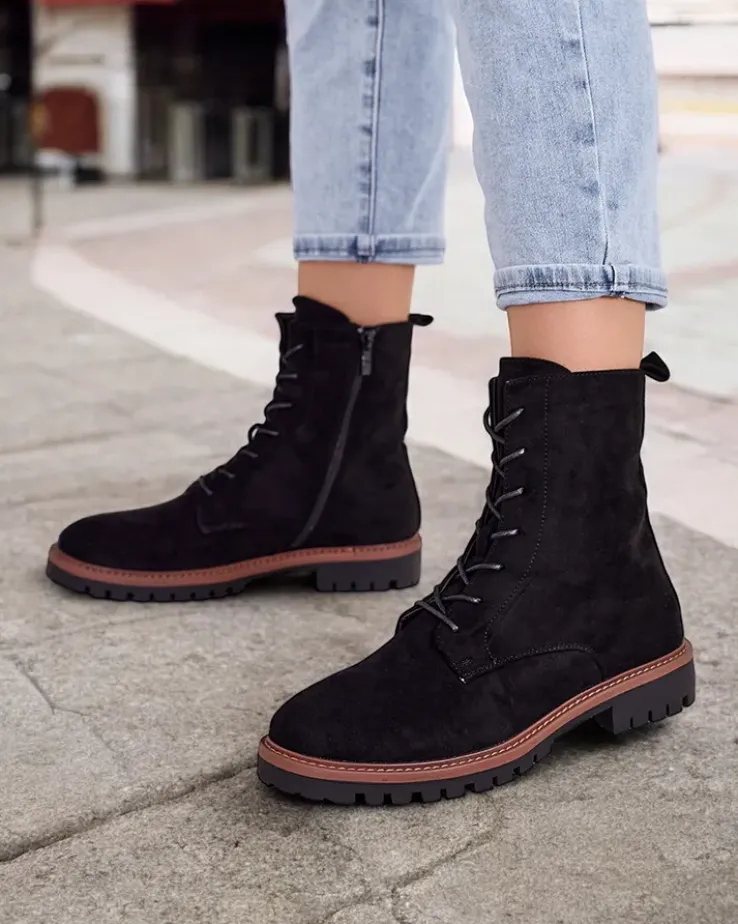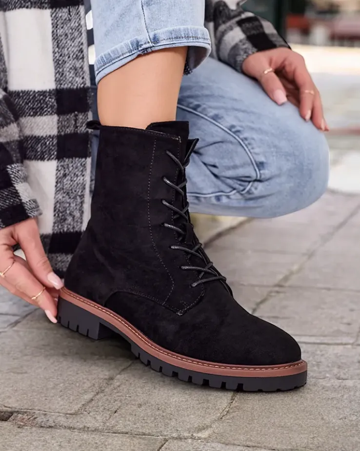 - Stylowe botki wykonane z eko skóry zamszowej. Buty są sznurowane. Model posiada grubszą podeszwę oraz futerkowe wypełnienie. Idealne na jesień!