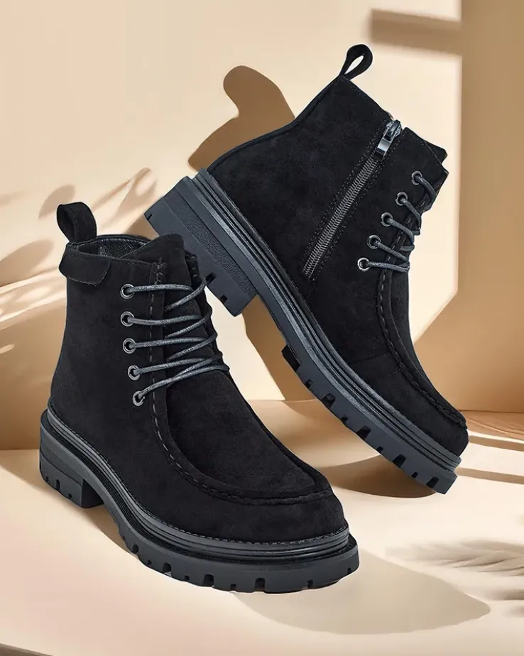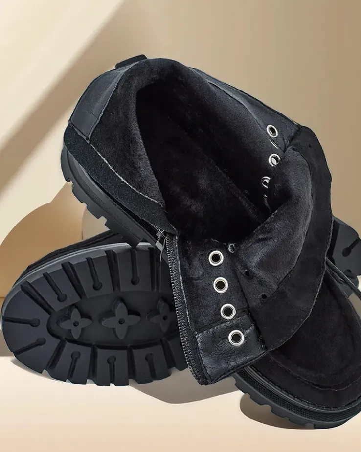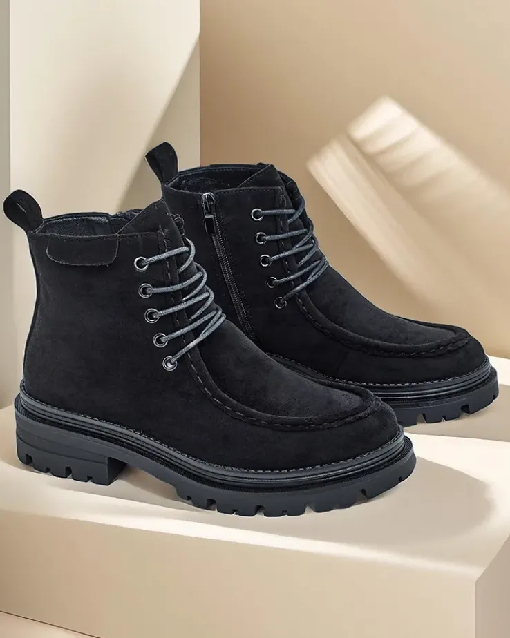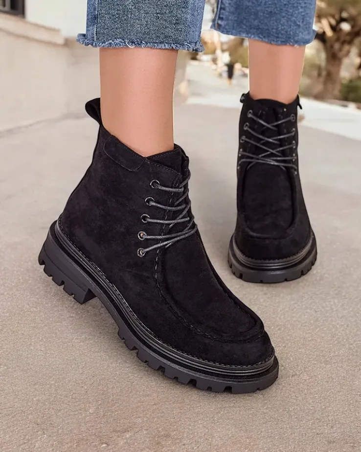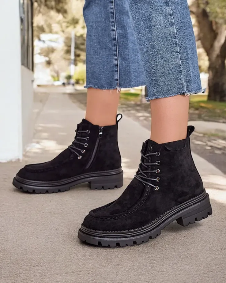 - Stylowe botki wykonane z eko skóry zamszowej i futerkowej wkładki. Buty są sznurowane i posiadają zapięcie na zamek. Model posiada grubszą podeszwę. Idealne na jesień!