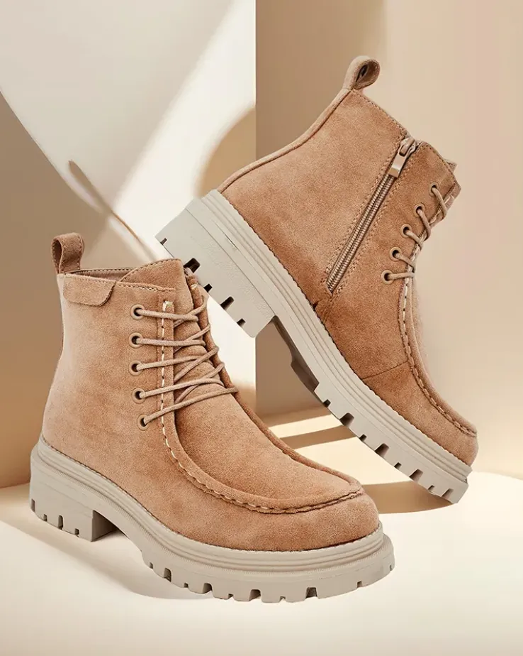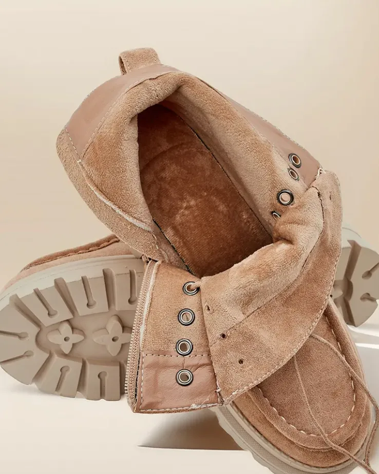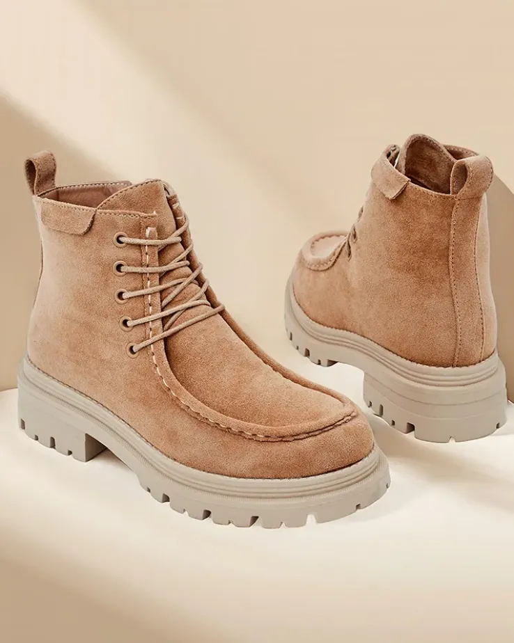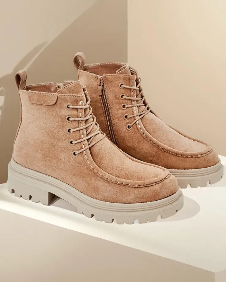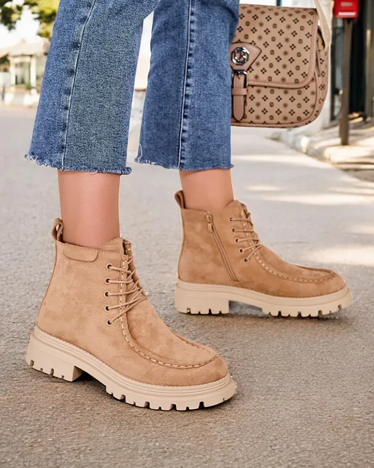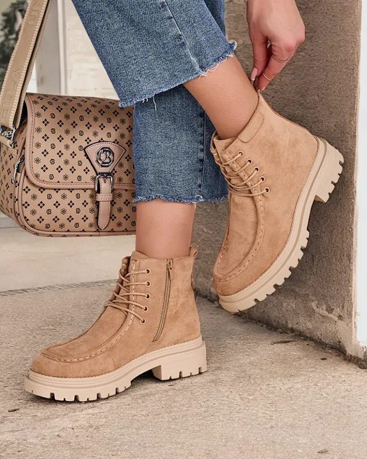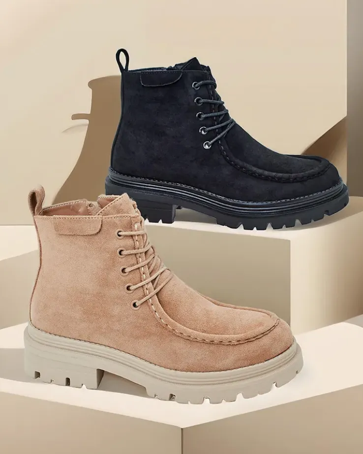 - Stylowe botki wykonane z eko skóry zamszowej i futerkowej wkładki. Buty są sznurowane i posiadają zapięcie na zamek. Model posiada grubszą podeszwę. Idealne na jesień!