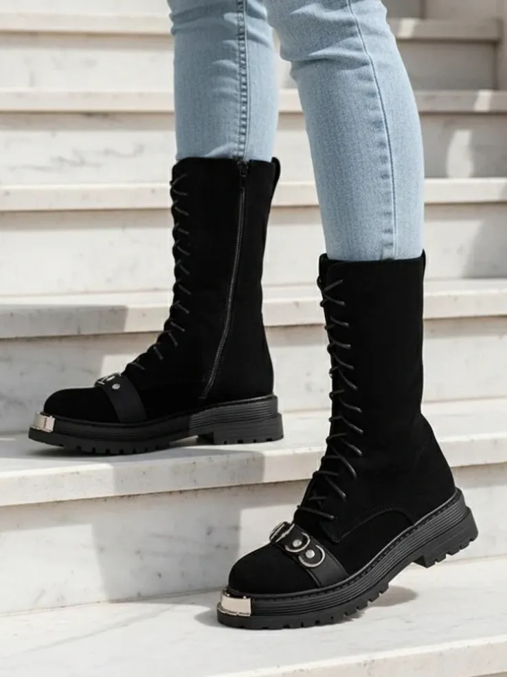 - Stylowe botki damskie wykonane z eko skóry zamszowej. Buty są sznurowane i zapinane na zamek. Model posiada płaską podeszwę oraz futerkowe wypełnienie. Idealne na jesień!