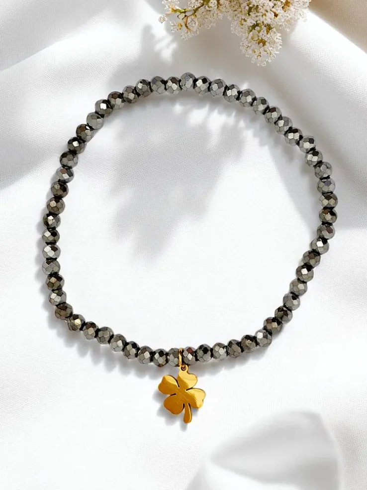 - Bransoletka z koralikami i zawieszką koniczynki to stylowy talizman szczęścia. Delikatna i elegancka, symbolizuje pomyślność, nadzieję i pozytywną energię. Idealna na co dzień, jako subtelny dodatek z wyjątkowym przesłaniem.