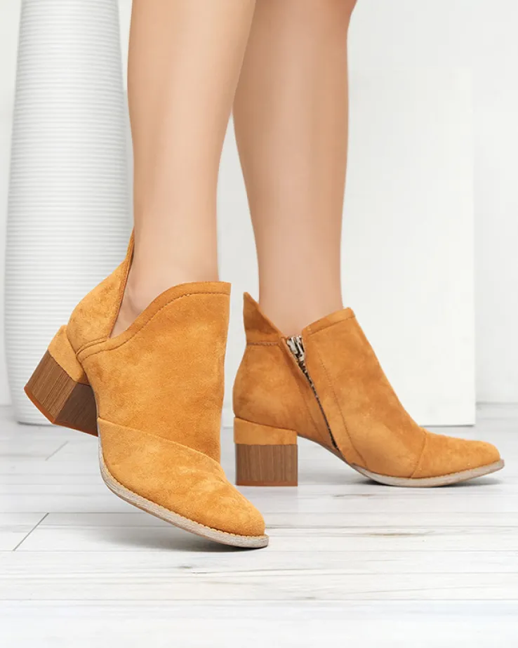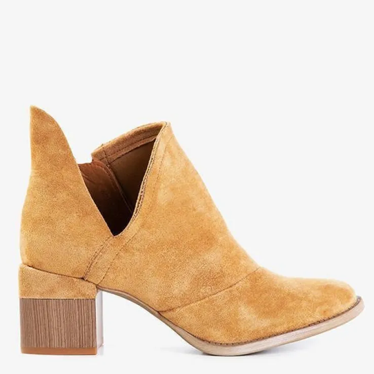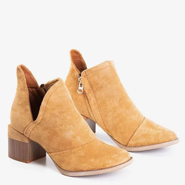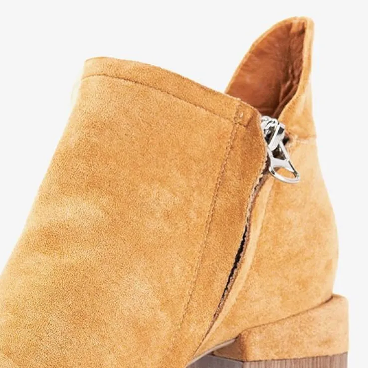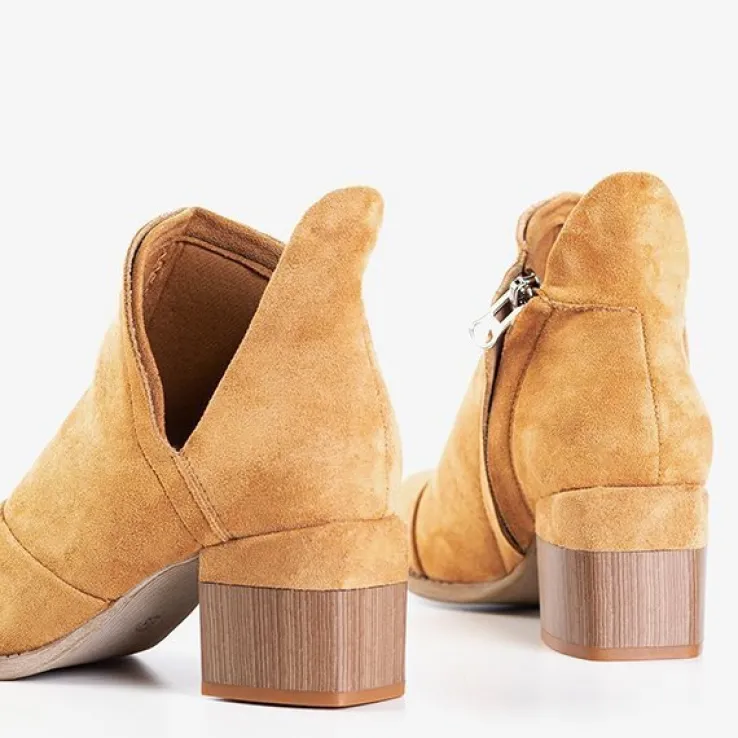 - Modne damskie botki z wycięciami na niskim słupku. Cholewka wykonana z eko-zamszu w kolorze brązowym, zaś wkładka pokryta tkaniną. Model zapinany na suwak po wewnętrznej stronie. Idealnie wkomponują się do każdej codziennej stylizacji!