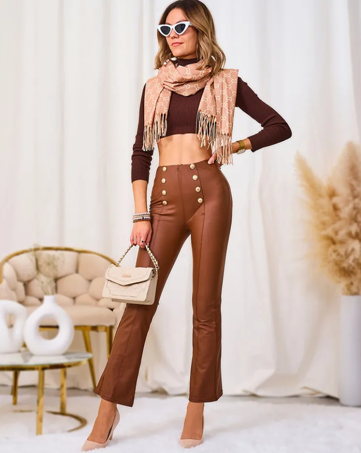 - Eko-skórzane legginsy a’la dzwony to połączenie stylu i komfortu. Model z gumą w pasie, doskonale dopasowuje się do figury, zapewniając wygodę i swobodę ruchów. Dodatkowo, ozdobione złotymi guzikami, te legginsy dodają stylizacji modnego charakteru.