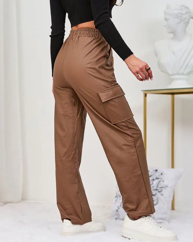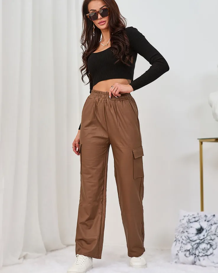- Kultowe damskie szerokie spodnie typu bojówki, wykonane ze skóry ekologicznej. Model posiada rozciągliwą gumkę w pasie i cztery wsuwane kieszenie. Doskonałe na co dzień! UWAGA: Dokładność pomiaru (+/-) 1 cm.