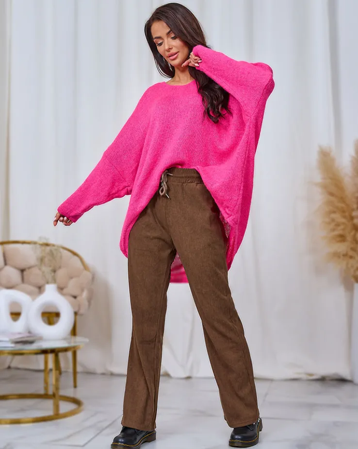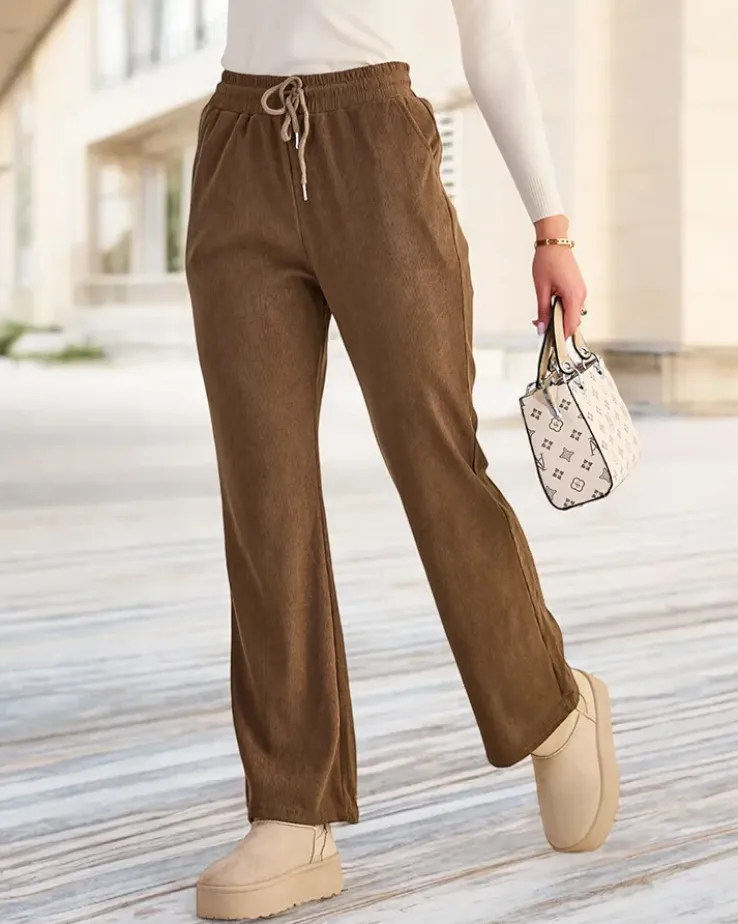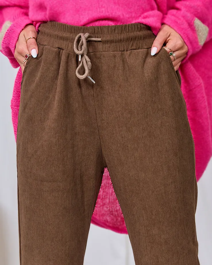 - Mega stylowe szerokie spodnie materiałowe wykonane z miękkiej tkaniny sztruksowej. Elastyczna guma w pasie z regulowanymi troczkami pozwala na dostosowanie spodni do swojego indywidualnego kształtu. Dodatkowo, dwie wsuwane kieszenie z przodu.
