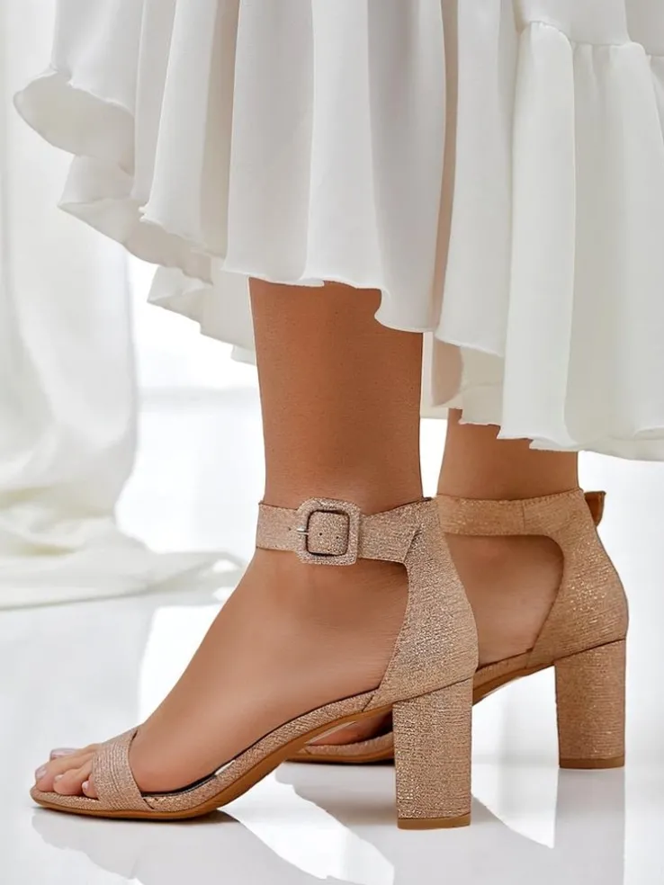 - Damskie sandałki na słupku – to idealny pomysł na gorące letnie dni. Model wykonany z tkaniny z brokatem i eko skórzanej wkładki. Obuwie zapinane na sprzączkę. Połączenie stylu i wygody!
