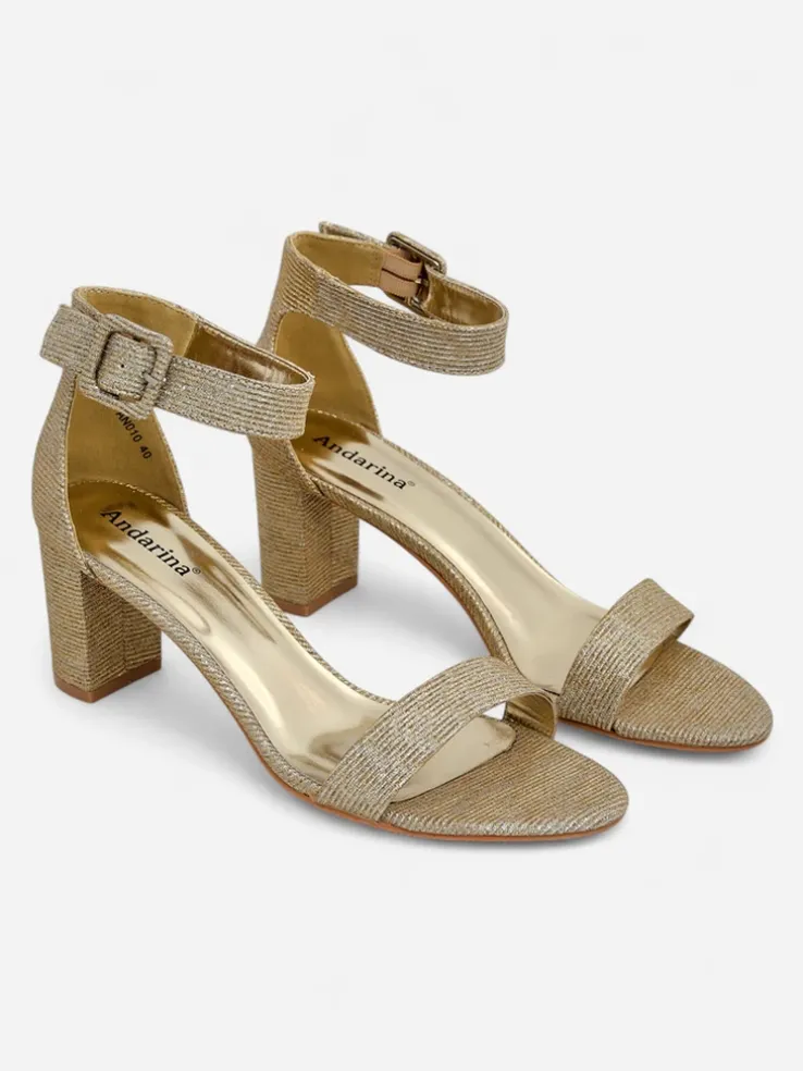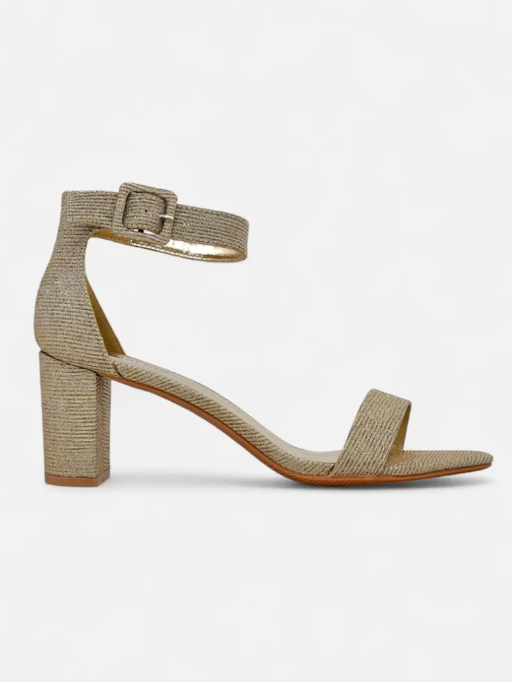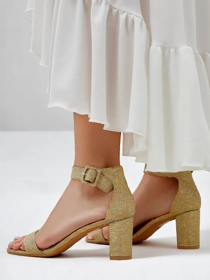 - Damskie sandałki na słupku – to idealny pomysł na gorące letnie dni. Model wykonany z tkaniny z brokatem i eko skórzanej wkładki. Obuwie zapinane na sprzączkę. Połączenie stylu i wygody!