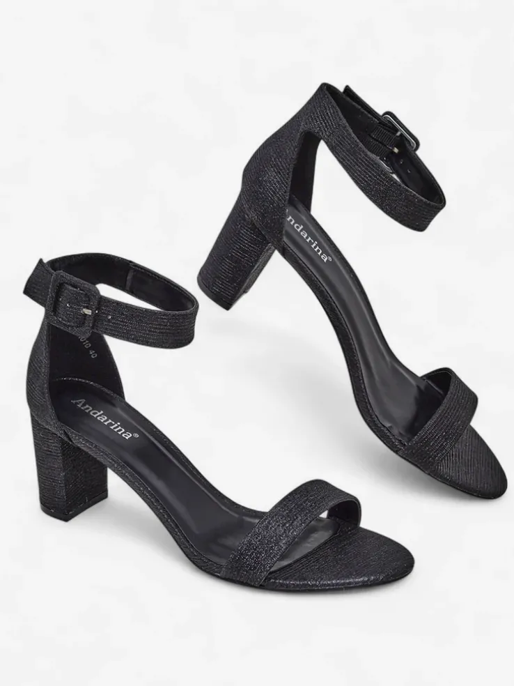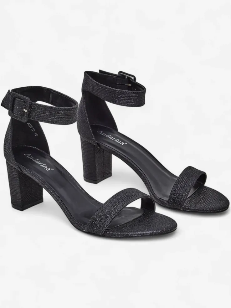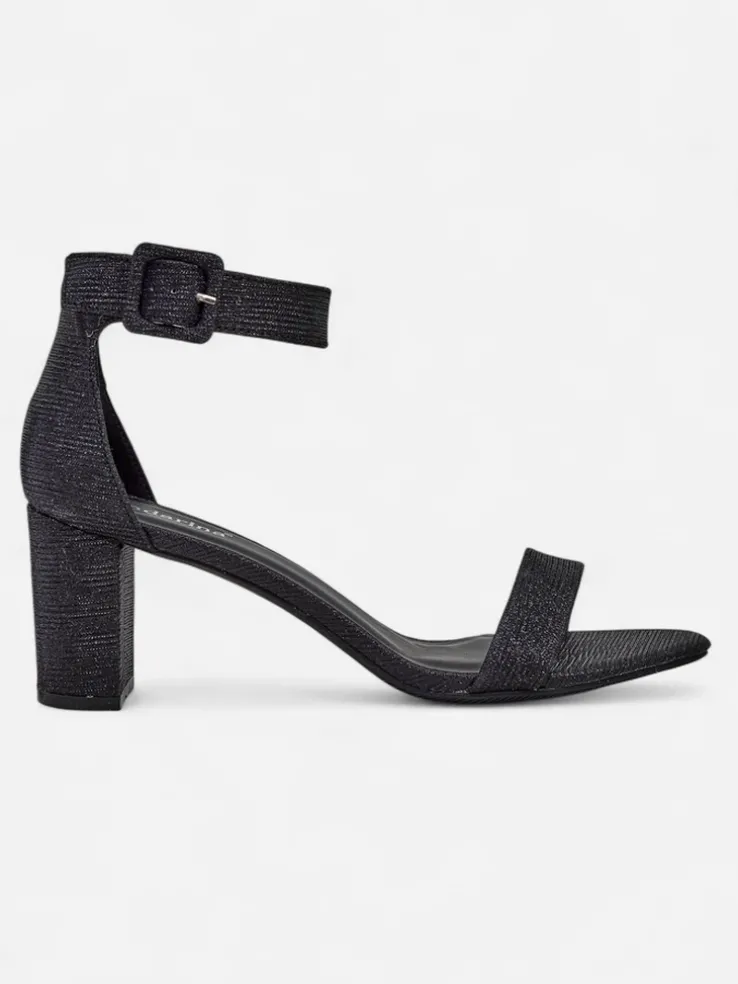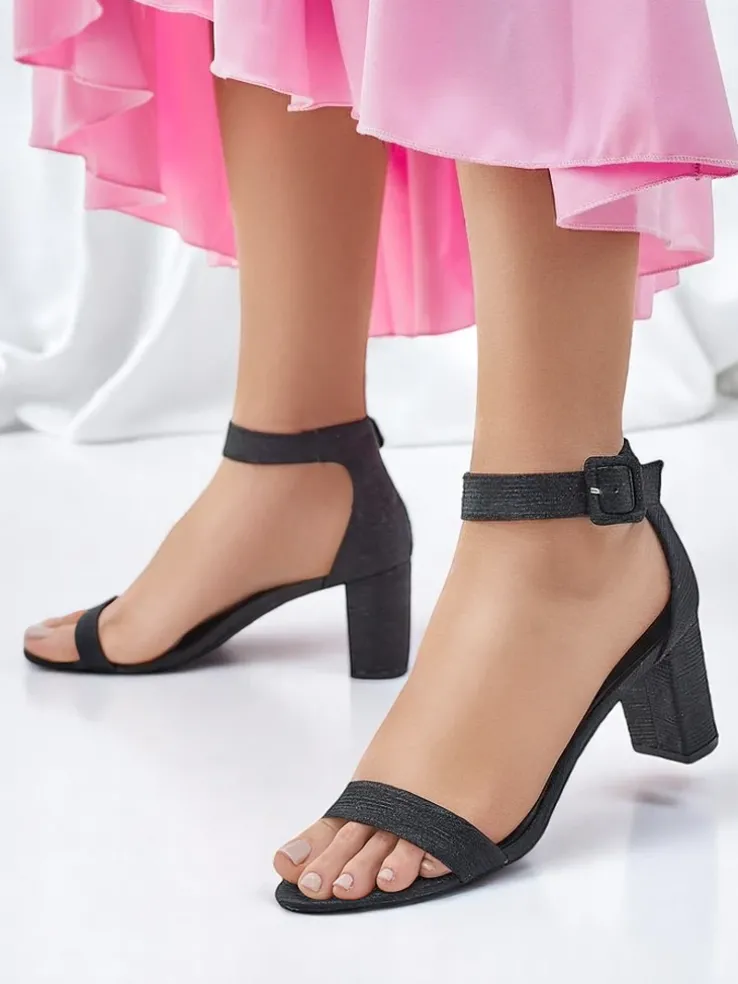 - Damskie sandałki na słupku – to idealny pomysł na gorące letnie dni. Model wykonany z tkaniny z brokatem i eko skórzanej wkładki. Obuwie zapinane na sprzączkę. Połączenie stylu i wygody!