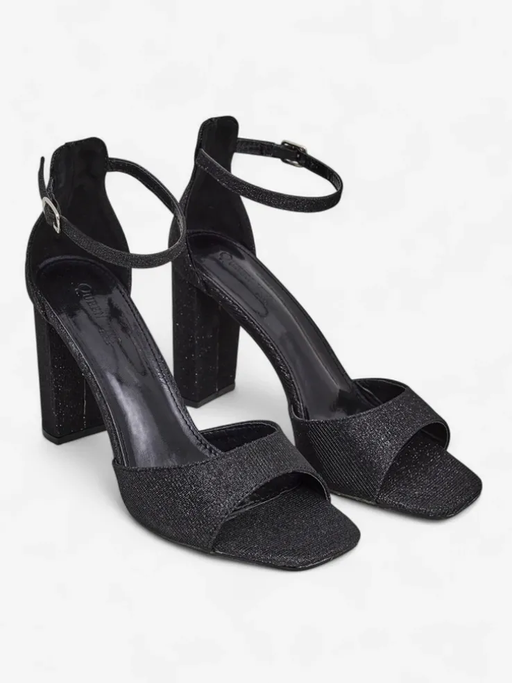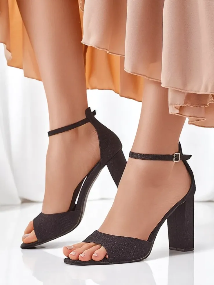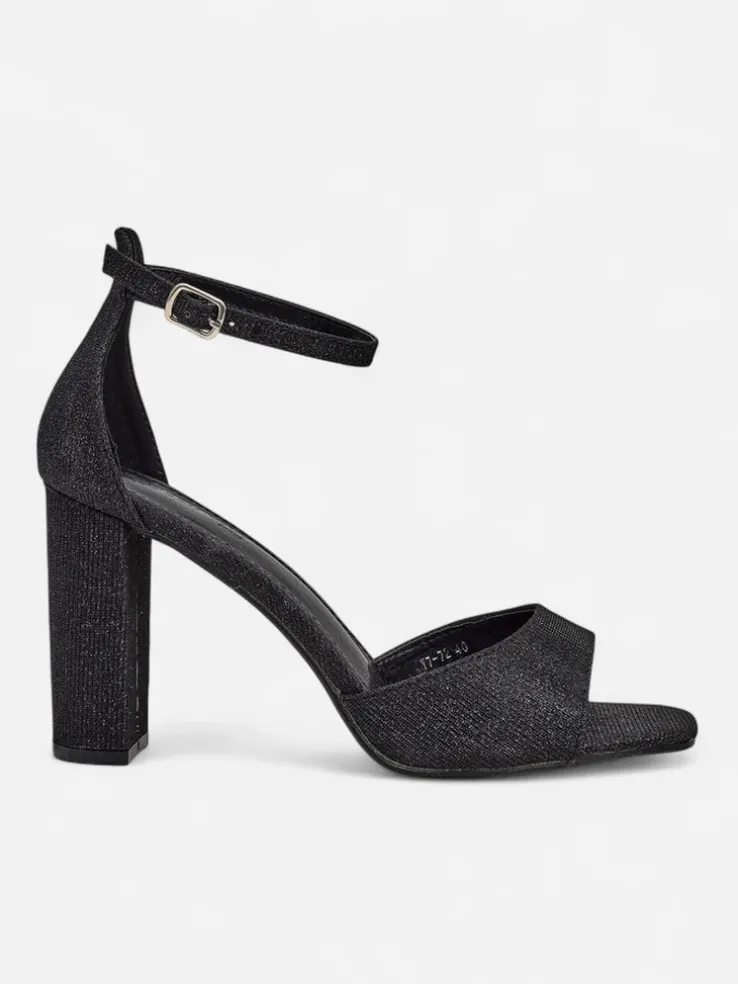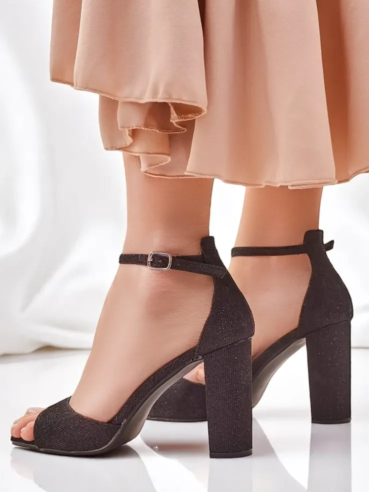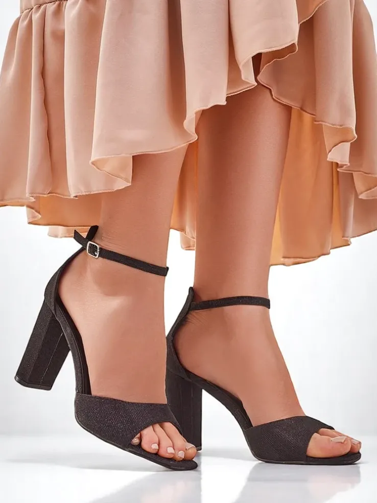 - Damskie sandałki na słupku – to idealny pomysł na gorące letnie dni. Model wykonany z tkaniny z brokatem i eko skórzanej wkładki. Obuwie zapinane na sprzączkę. Połączenie stylu i wygody!