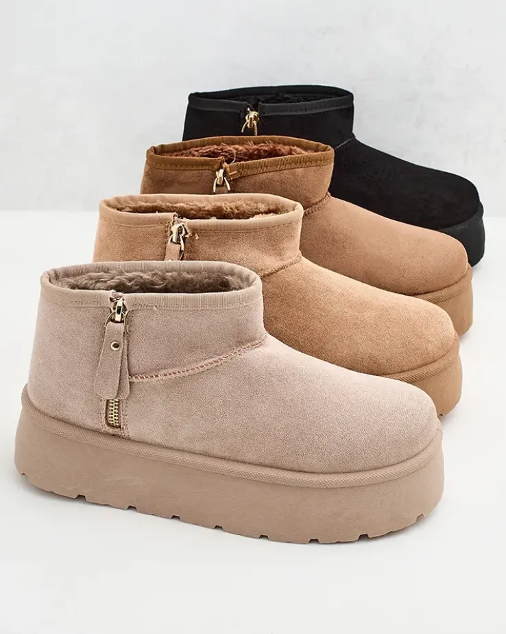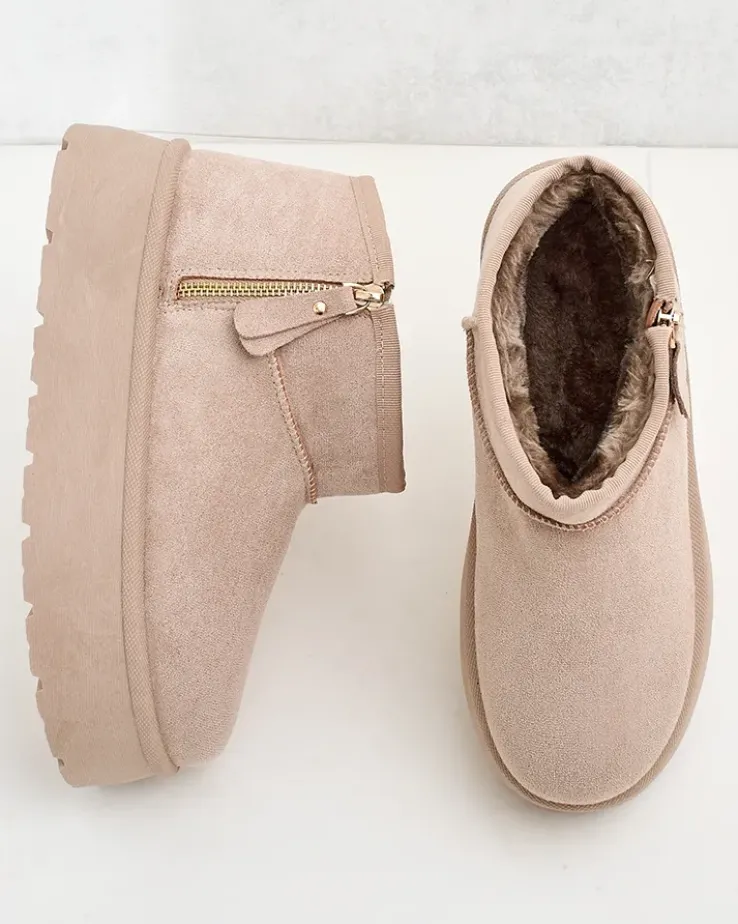 - Świetne damskie zimowe buty typu śniegowce na platformie. Cholewka wykonana jest ze skóry ekologicznej zamszowej, środek ocieplony futerkiem. Model posiada ozdobny suwak. Idealna baza na zimę!
