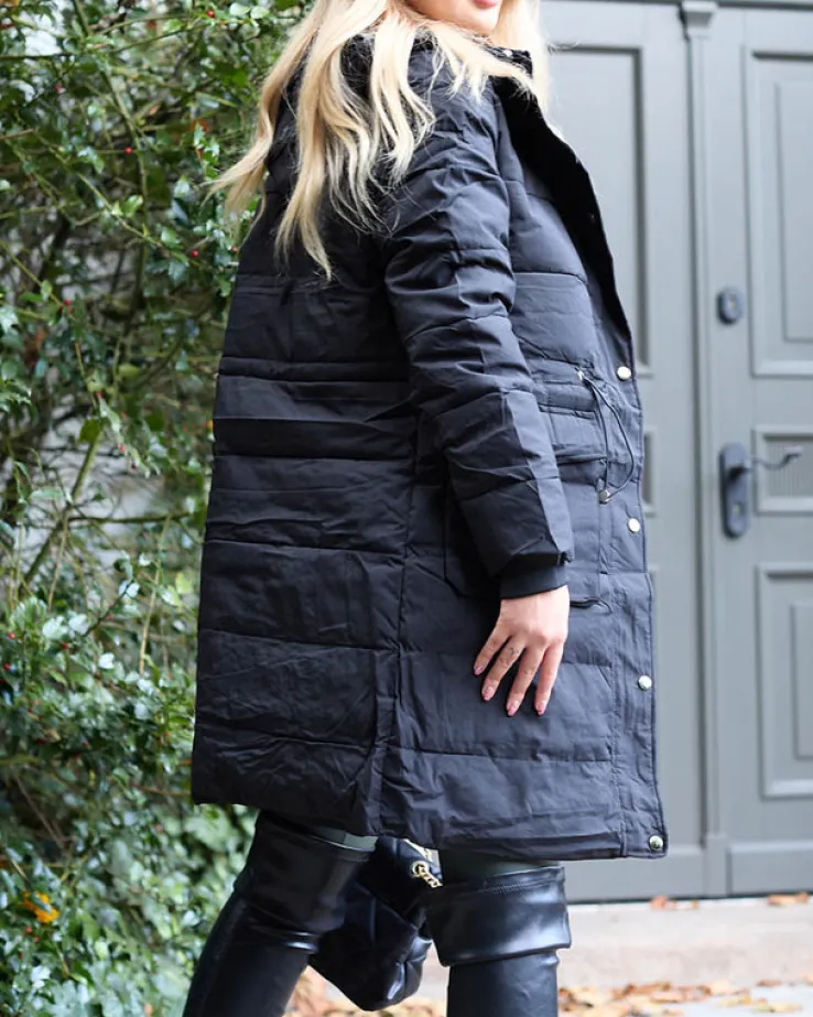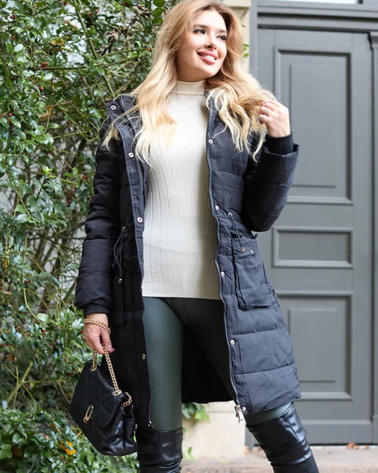 - Stylowa damska długa, pikowana kurtka z kapturem. Produkt z 2 zapinanymi kieszeniami, posiada wypełnienie z puchu syntetycznego. W pasie regulowany ściągacz, wewnątrz rękawa bawełniane gumy ściągające. Dokładność pomiaru (+/-) 1 cm.