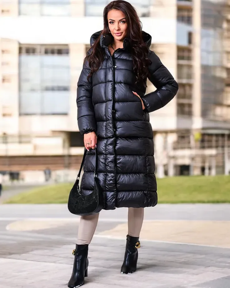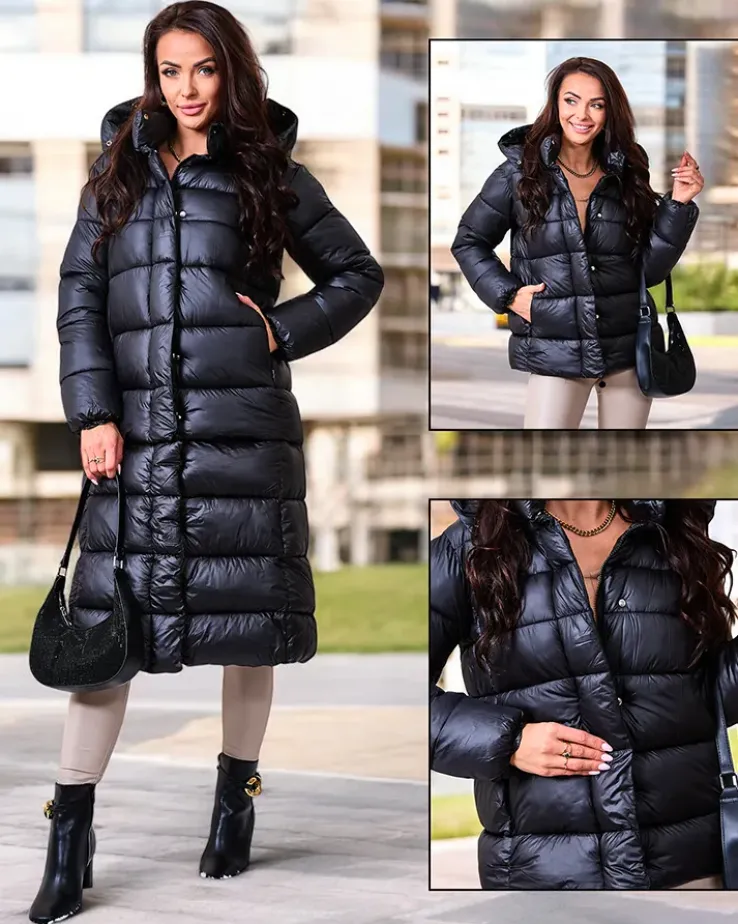 - Ciepła damska kurtka zimowa z odpinanym dołem. Model z możliwością noszenia za kolano lub do bioder. Posiada kaptur, 2 zapinane kieszenie i wypełnienie z puchu syntetycznego. Kurtka zapinana suwakiem i na zatrzaski.