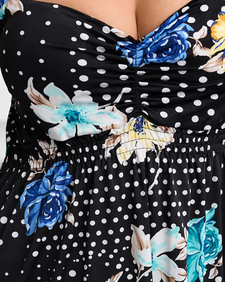 - Modna damska długa sukienka wykonana ze śliskiej tkaniny w groszki. Model na ramiączkach, posiada dekolt w serek i gumę podkreślającą talię. Doskonała sukienka na lato! UWAGA: Dokładność pomiaru (+/-) 1 cm.