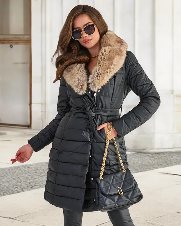 - Prosta damska kurtka zimowa z odpinanym, cieplutkim futerkiem. Górna część w środku również posiada miękkie futerko. Kurtka zapinana suwakiem i guzikami, posiada 2 zapinane kieszonki oraz pasek z tyłu. Świetna na zimową porę!