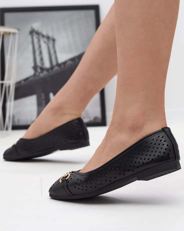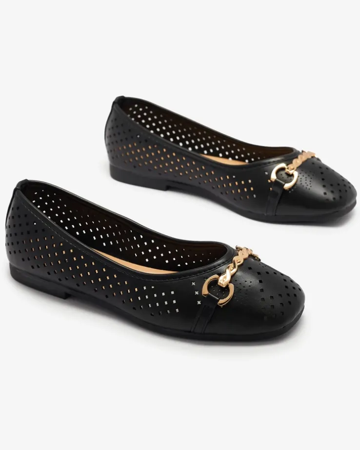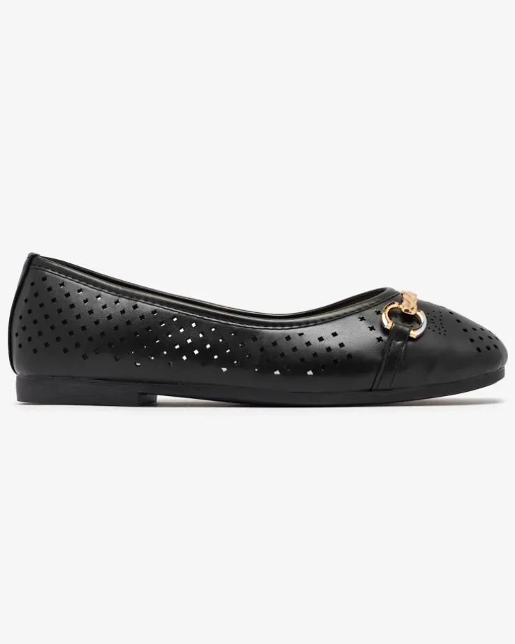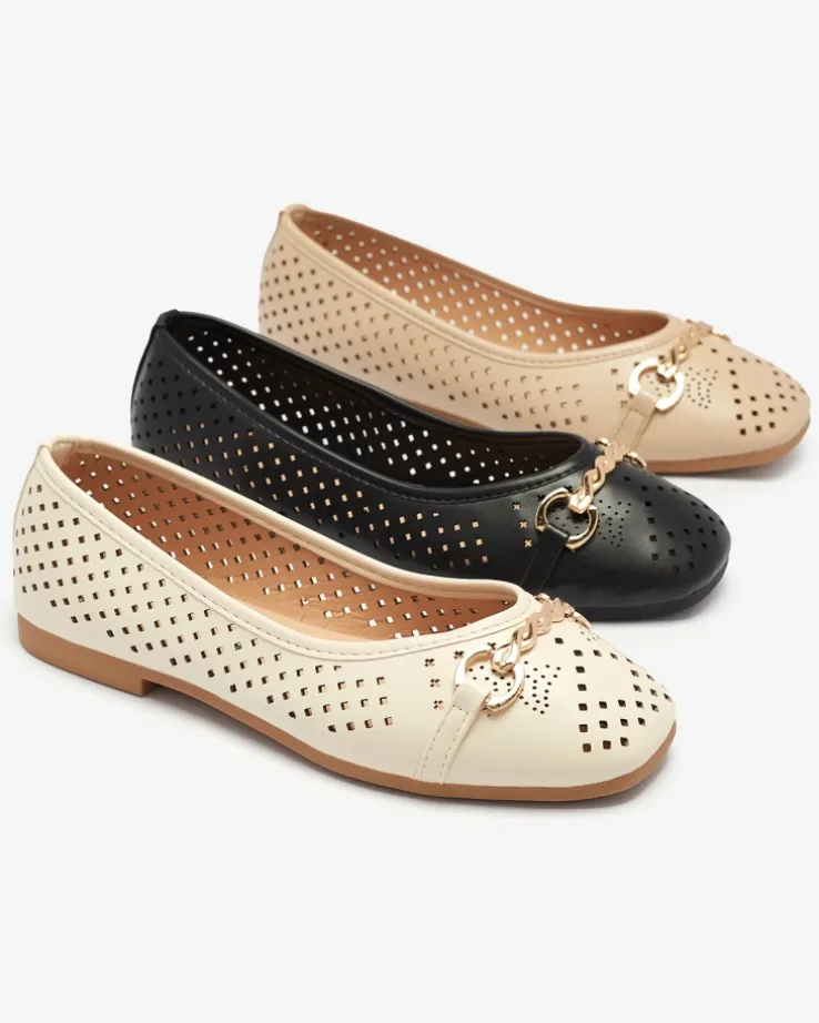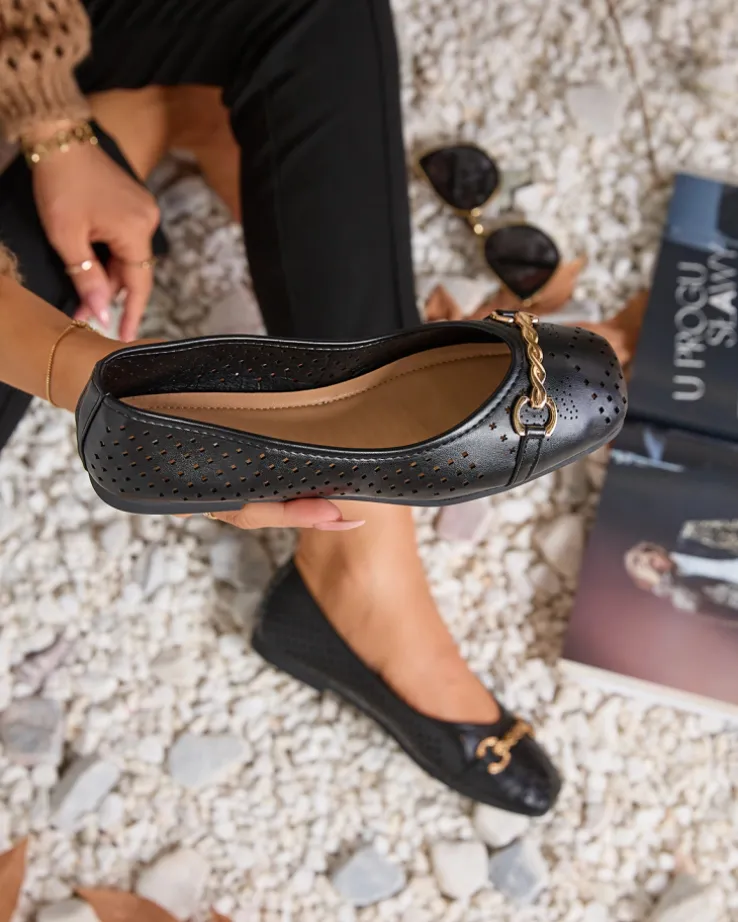 - Stylowe damskie ażurowe baleriny na płaskim obcasie. Cholewka jak i wkładka wykonane są ze skóry ekologicznej, nosek zdobiony złotą ozdobą. Super dodatek do Twoich casualowych outfitów!
