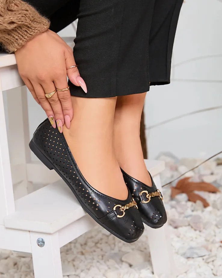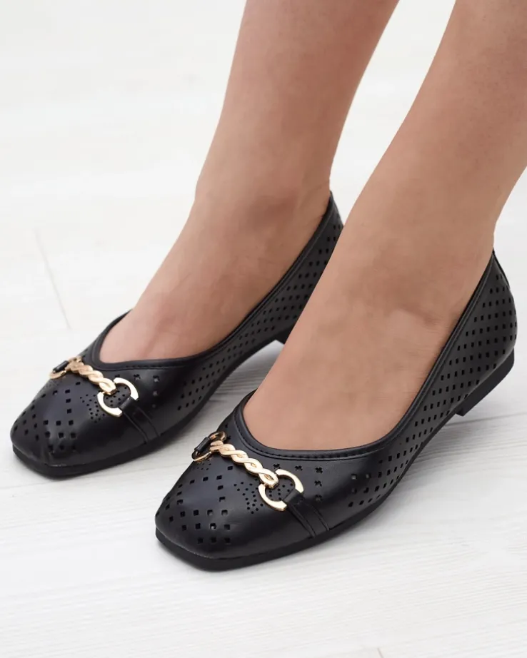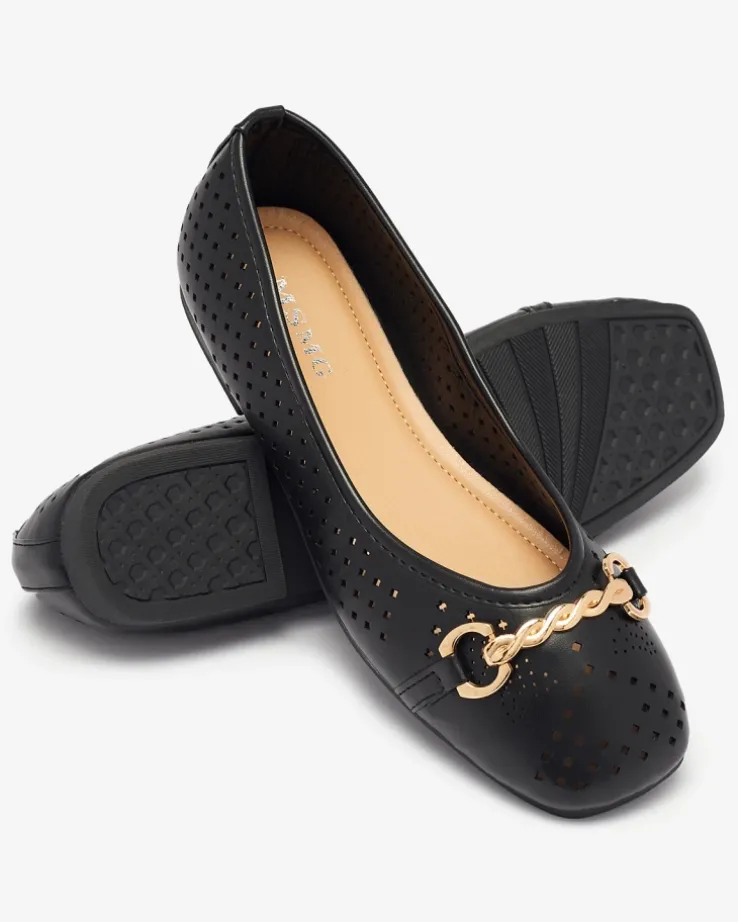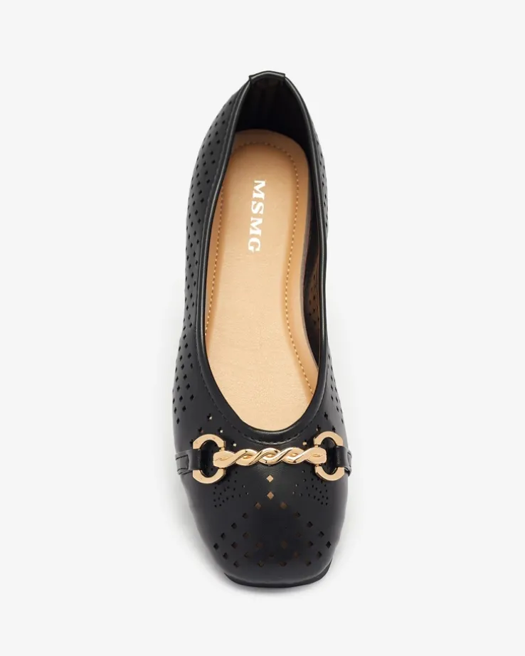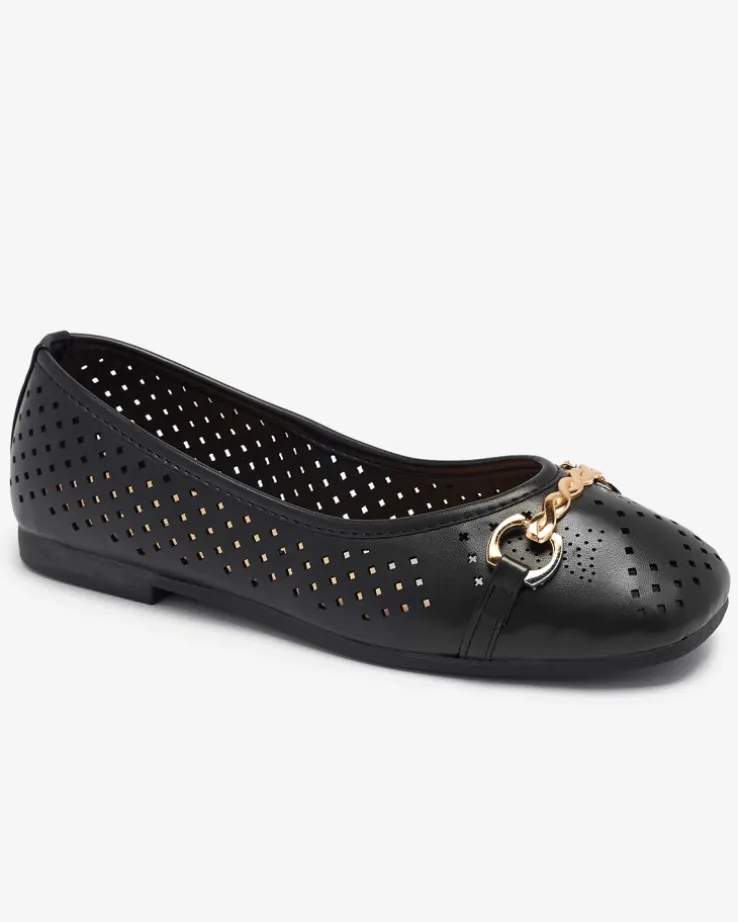 - Stylowe damskie ażurowe baleriny na płaskim obcasie. Cholewka jak i wkładka wykonane są ze skóry ekologicznej, nosek zdobiony złotą ozdobą. Super dodatek do Twoich casualowych outfitów!