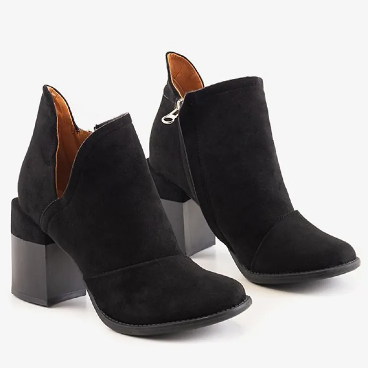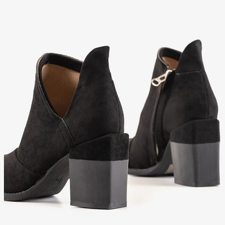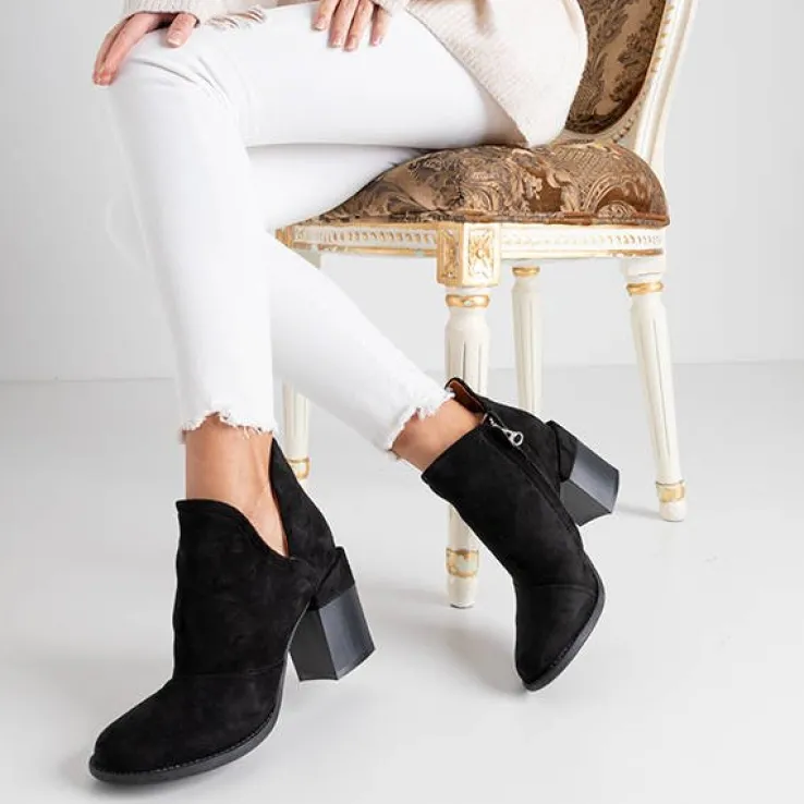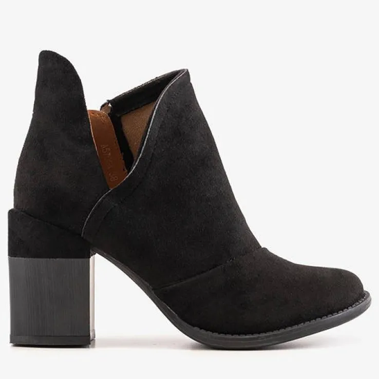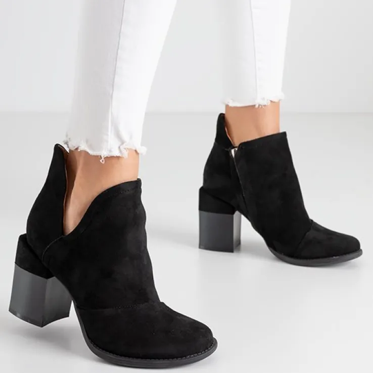 - Oryginalne damskie botki na słupku z okrągłym noskiem. Materiał wykonania to eko-skóra zamszowa, w środku eko-skórzana wkładka. Cholewka zapinana suwakiem, po boku posiada wycięcia. Idealny dodatek do jesiennych stylizacji.