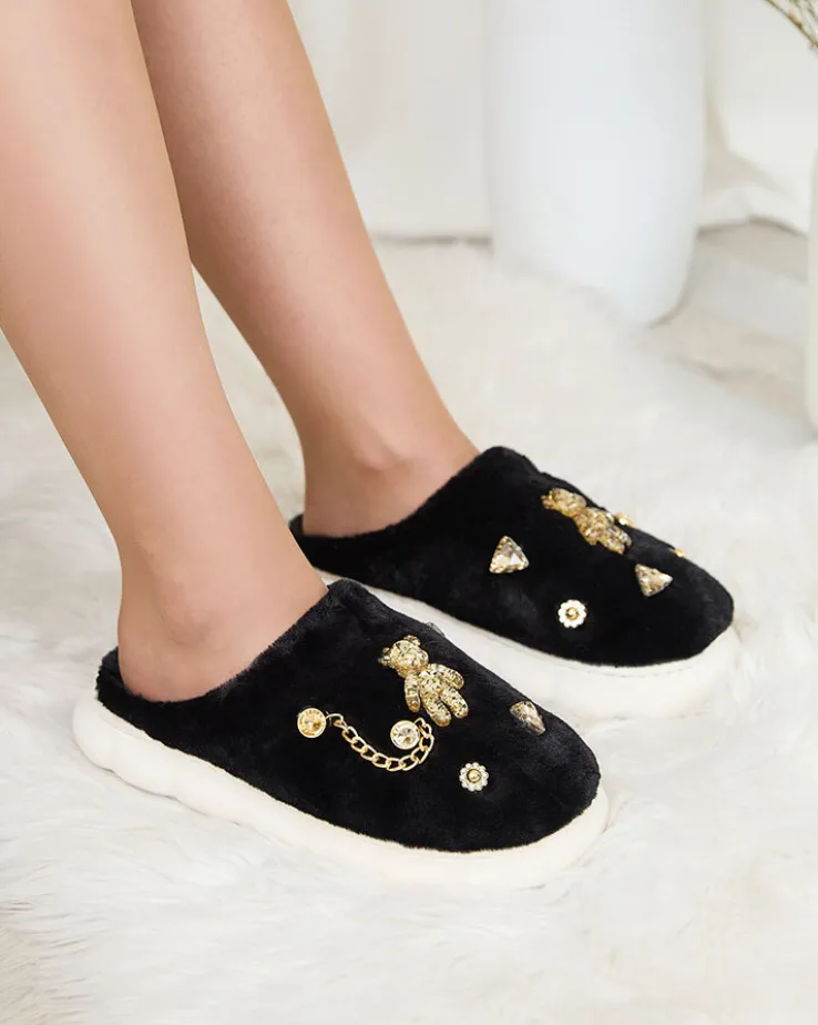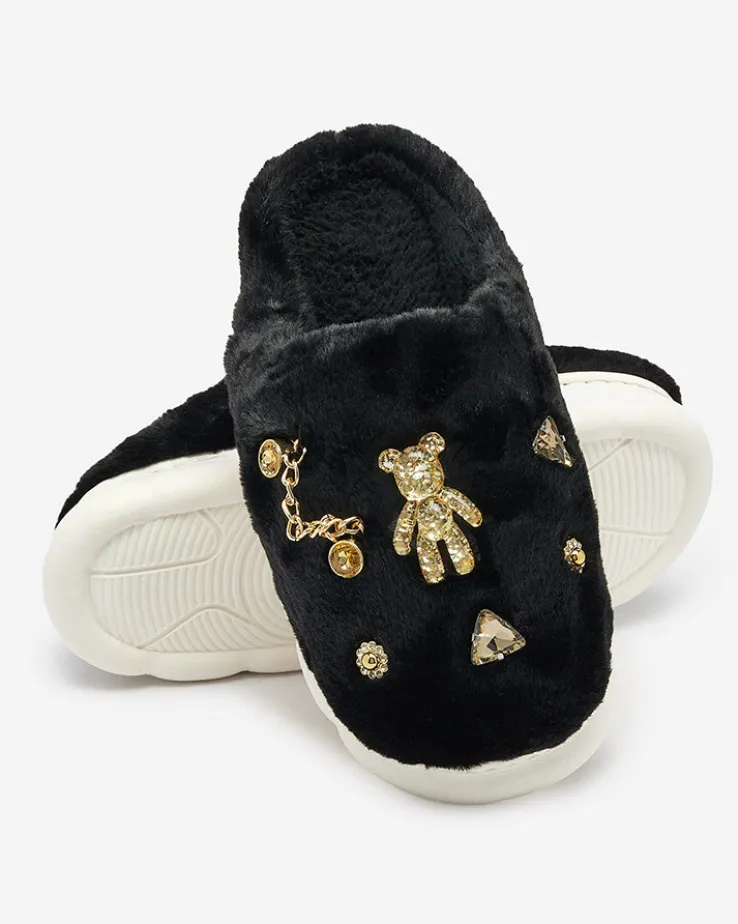 - Rewelacyjne damskie kapcie na płaskiej podeszwie, zdobione łańcuszkami i plastikowymi ozdobami w kształcie misia. Model wykonany z materiału imitującego futerko. Świetna propozycja dla domowych outfitów!
