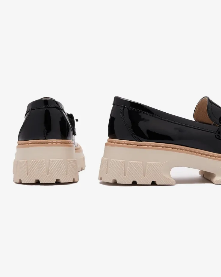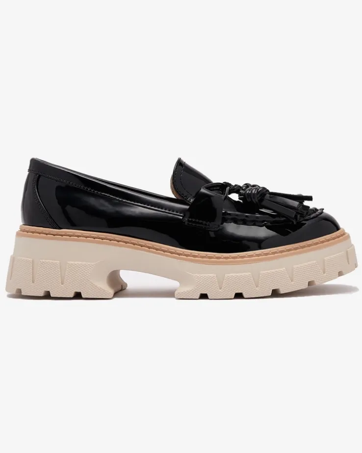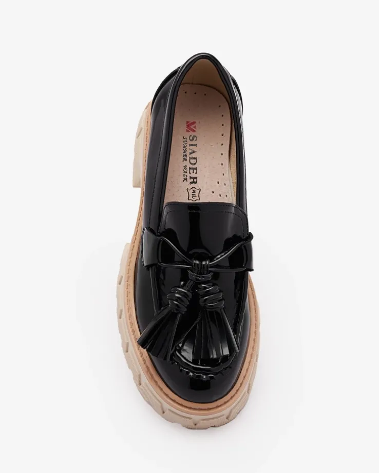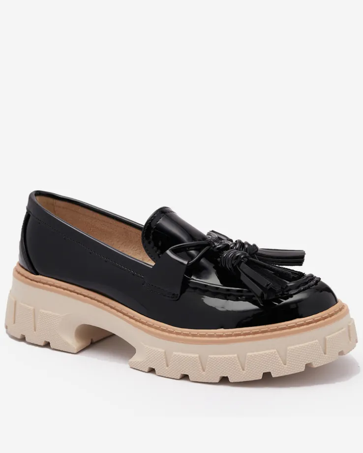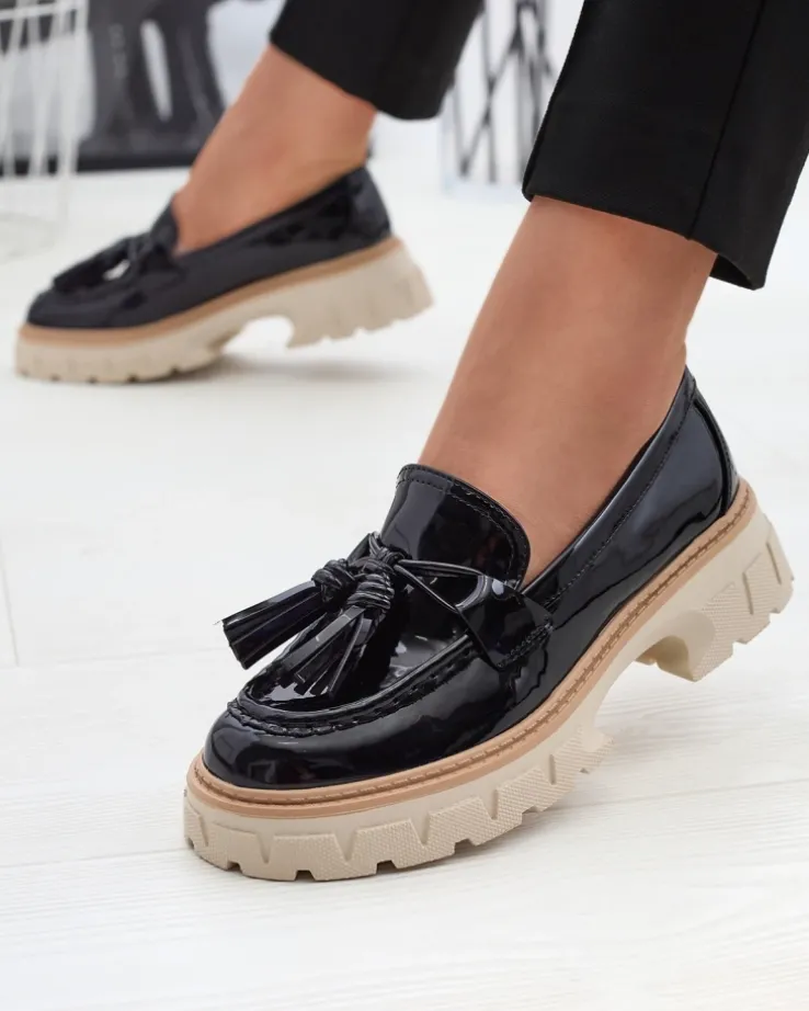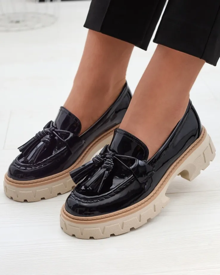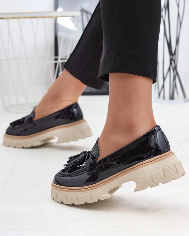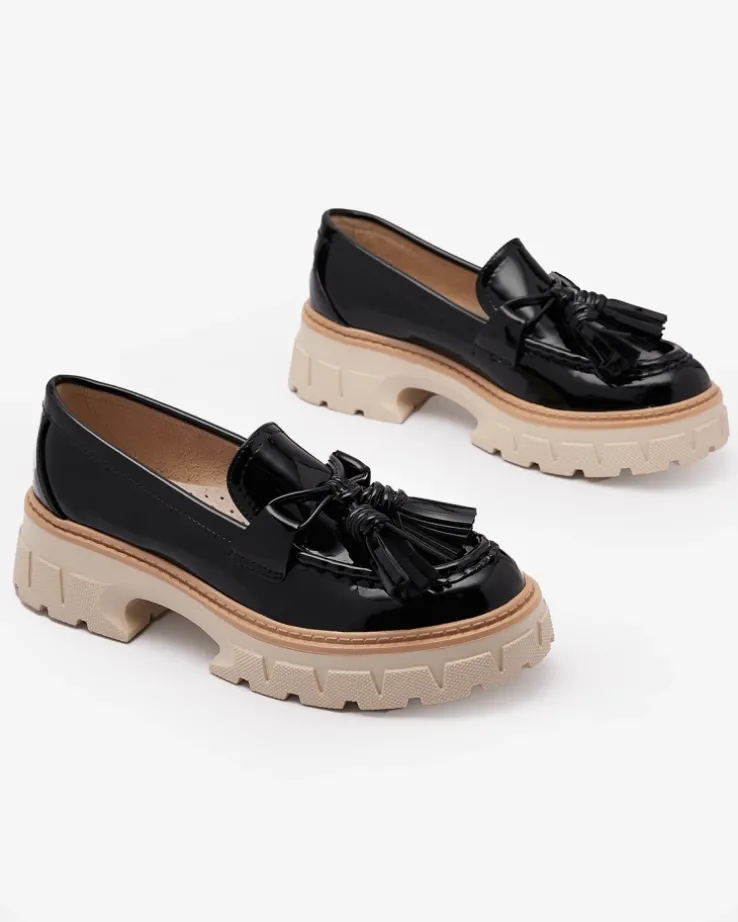 - Rewelacyjne damskie mokasyny na masywnej podeszwie. Obuwie jest wykonane ze skóry ekologicznej lakierowanej, a wkładka to skóra naturalna. Na nosku ozdoba z frędzelkami. Model w stylu casual! UWAGA: model preferowany dla osób o wąskiej anatomii stopy.