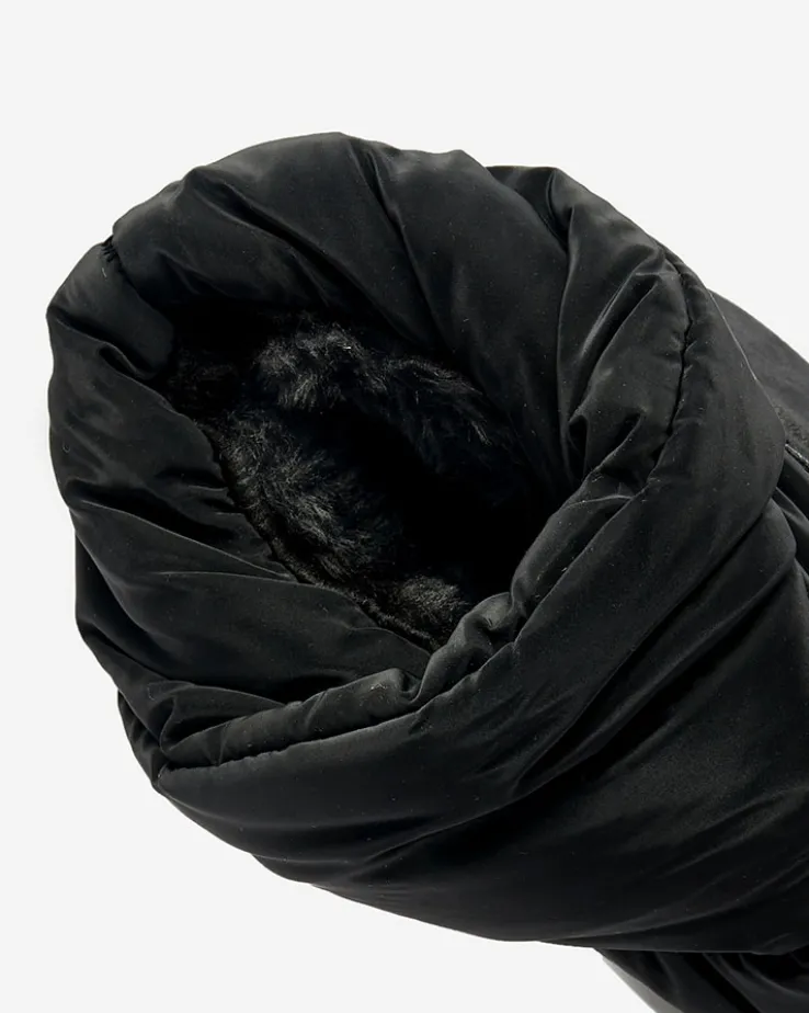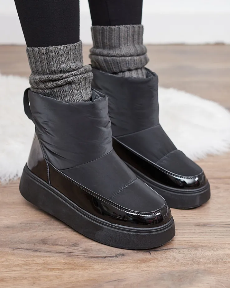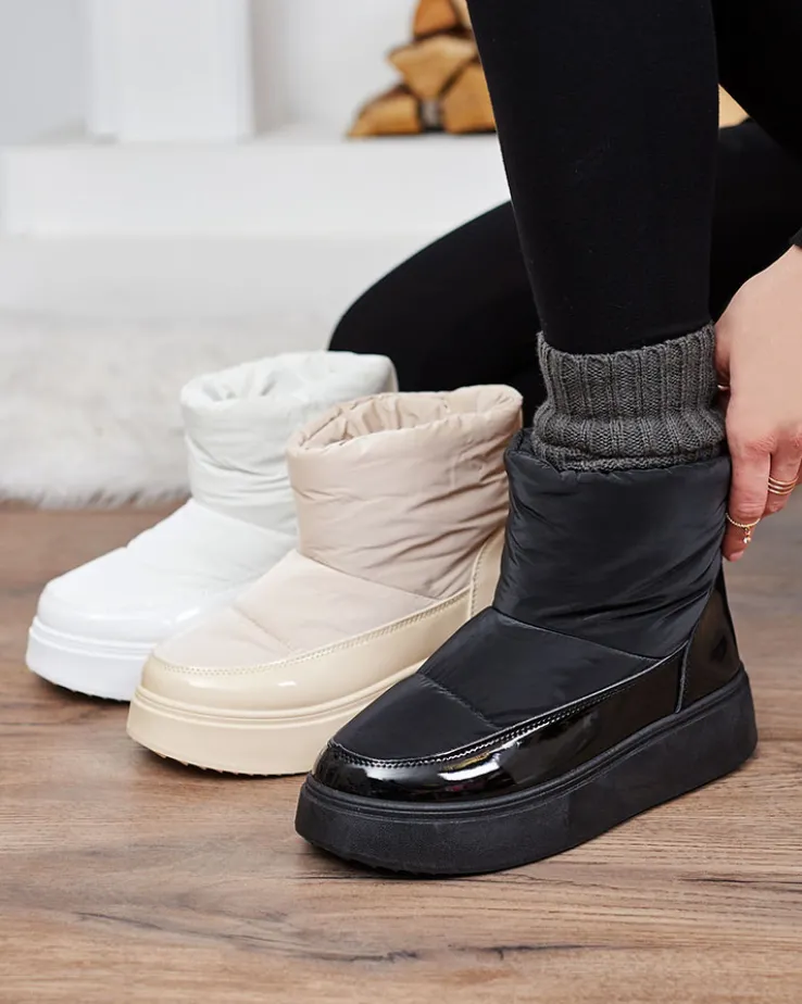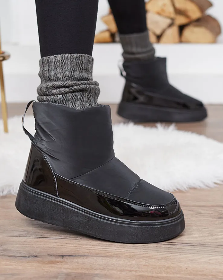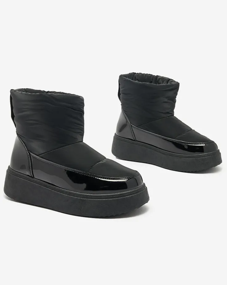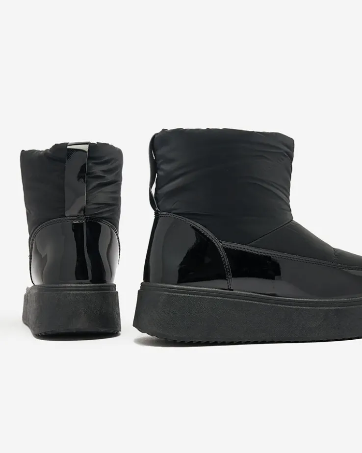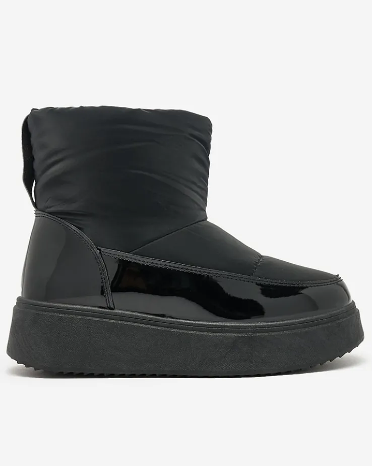 - Ponadczasowe damskie obuwie typu śniegowce. Model z cholewką wykonaną z materiału a’la cerata i wstawkami z lakierowanej eko skóry. W środku ocieplenie w formie futerka, obuwie wsuwane. Idealne na chłodniejszą porę roku!