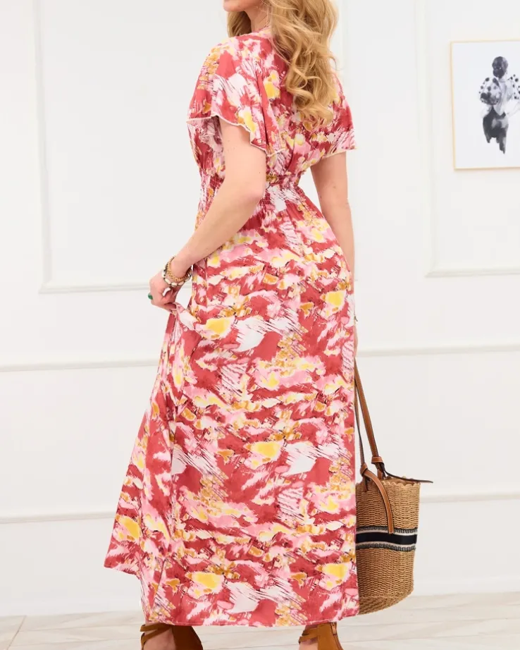 - Modna damska sukienka o długości midi, wykonana z miękkiej tkaniny z ciekawym wzorem. Model z kopertowym dekoltem, posiada krótkie rękawy i szeroką gumę podkreślającą talię. Doskonała na co dzień! UWAGA: Dokładność pomiaru (+/-) 1 cm.