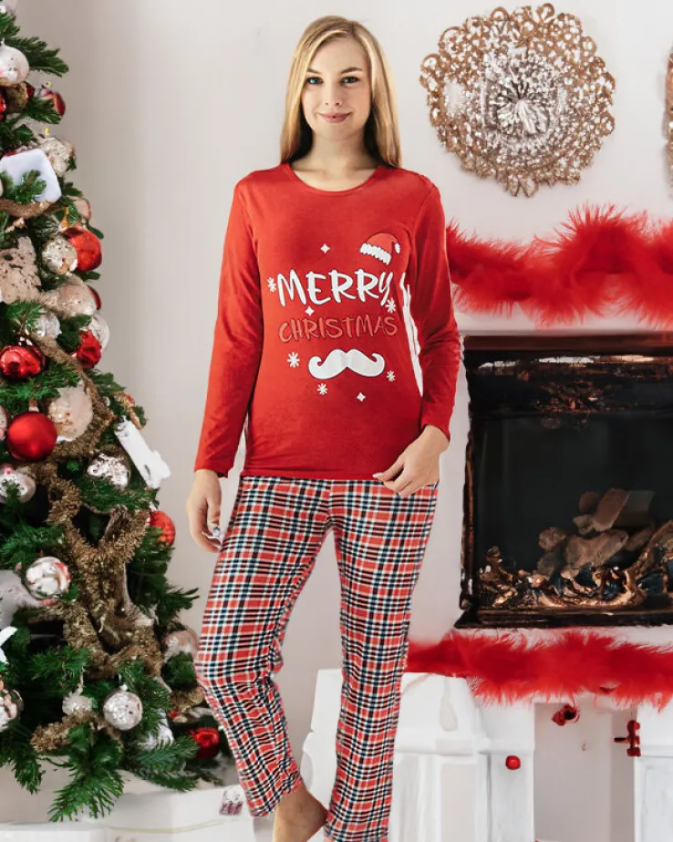 - Świąteczna damska 2-częściowa piżama wykonana z tkaniny bawełnianej wykończonej ozdobnym printem. Komplet posiada bluzkę z długimi rękawami oraz spodnie z gumą w pasie i prostymi nogawkami. UWAGA: Dokładność pomiaru (+/-) 1 cm.