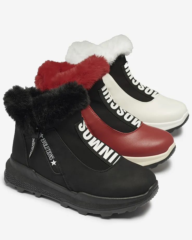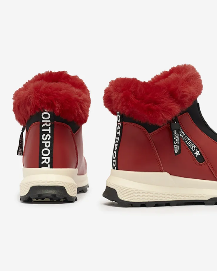 - Damskie botki wykonane ze skóry ekologicznej, środek jest ocieplany miękkim futerkiem. Z przodu cholewki elastyczna wstawka z ozdobnym napisem, obuwie zapinane na suwak. CZERWONE BUTY BOTKI DAMSKIE OCIEPLANE SCHERR