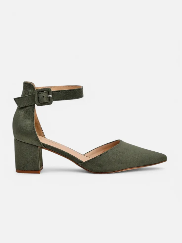 - Stylowe damskie czółenka na niskim słupku z noskiem w szpic. Cholewka wykonana ze skóry ekologicznej zamszowej, wkładka to skóra ekologiczna. Model zapinany na sprzączkę, idealny do biura!