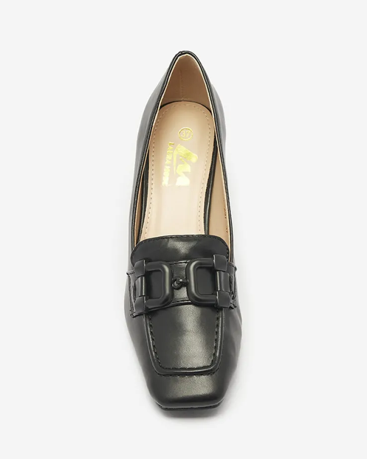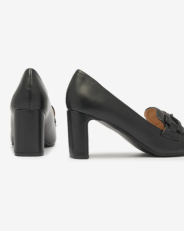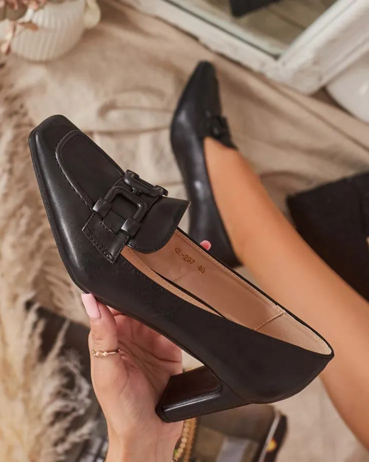 - Ciekawe czółenka damskie na słupku, wykonane ze skóry ekologicznej. Wkładka również z eko-skóry. Kwadratowy nosek z ozdobą dodaje im uroku. Must have tego sezonu!
