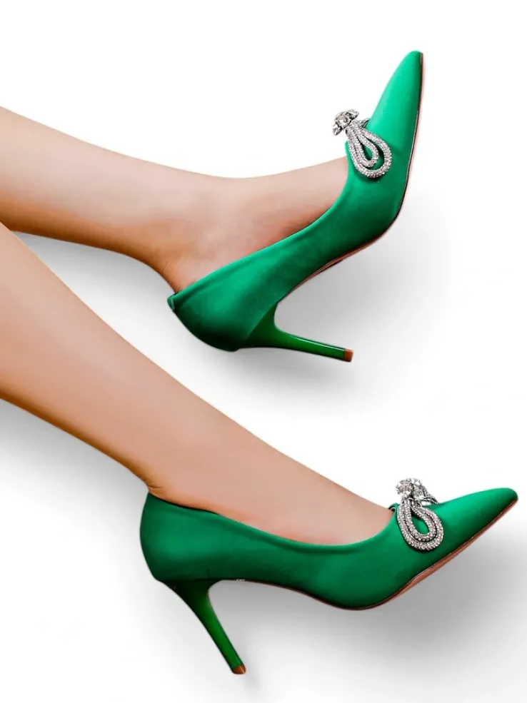 - Czółenka damskie na słupku. Model pokryty tkaniną i posiada wkładkę ze skóry ekologicznej. Nosek w szpic z kokardką nadaje im zmysłowej elegancji. Załóż je do eleganckiej sukienki!