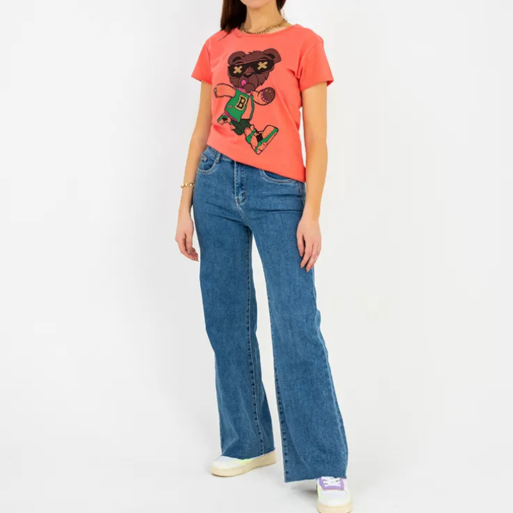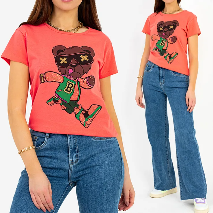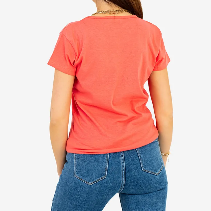 - T-shirt damski z bawełny, z krótkimi rękawami i okrągłym dekoltem. Na przodzie koszulka jest udekorowana printem. Idealna na lato! UWAGA: Dokładność pomiaru (+/-) 1 cm.
