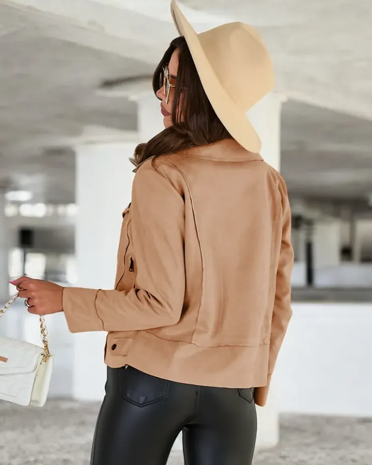 - Ponadczasowa damska kurtka typu ramoneska, wykonana z miękkiego eko-zamszu – to idealny wybór na jesień! Model zapinany suwakiem, posiada dwie zasuwane kieszenie po bokach. UWAGA: Dokładność pomiaru (+/-) 1 cm.