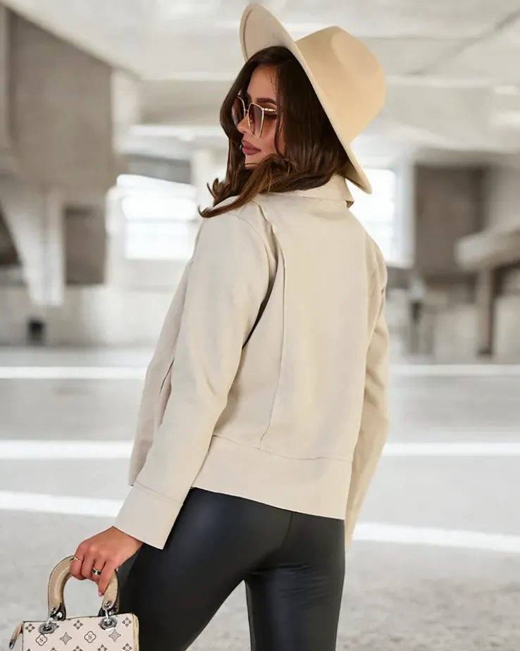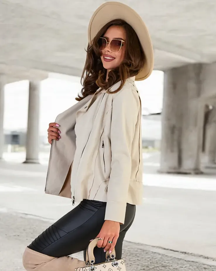 - Ponadczasowa damska kurtka typu ramoneska, wykonana z miękkiego eko-zamszu – to idealny wybór na jesień! Model zapinany suwakiem, posiada dwie zasuwane kieszenie po bokach. UWAGA: Dokładność pomiaru (+/-) 1 cm.