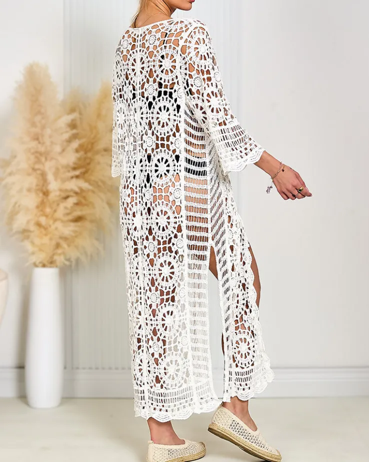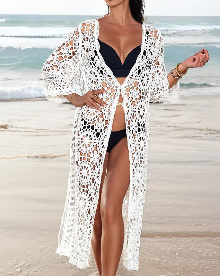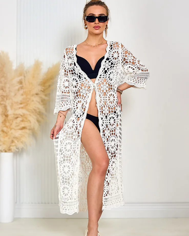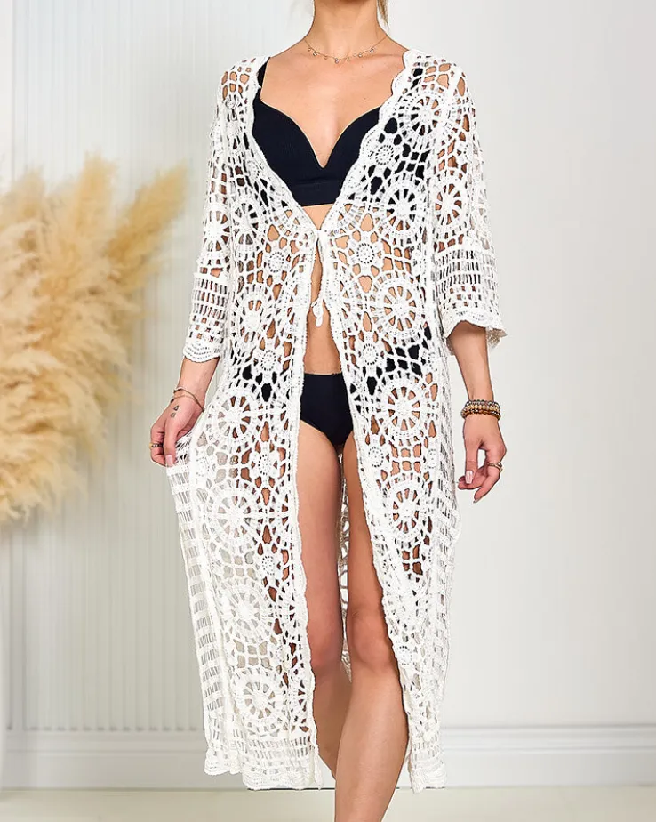 - Damska narzutka plażowa typu sukienka, wykonana z miękkiej koronkowej tkaniny bawełnianej. Model z rękawami 3/4 oraz wiązaniem przy dekolcie. Idealna na spacer po plaży! UWAGA: Dokładność pomiaru (+/-) 1 cm.