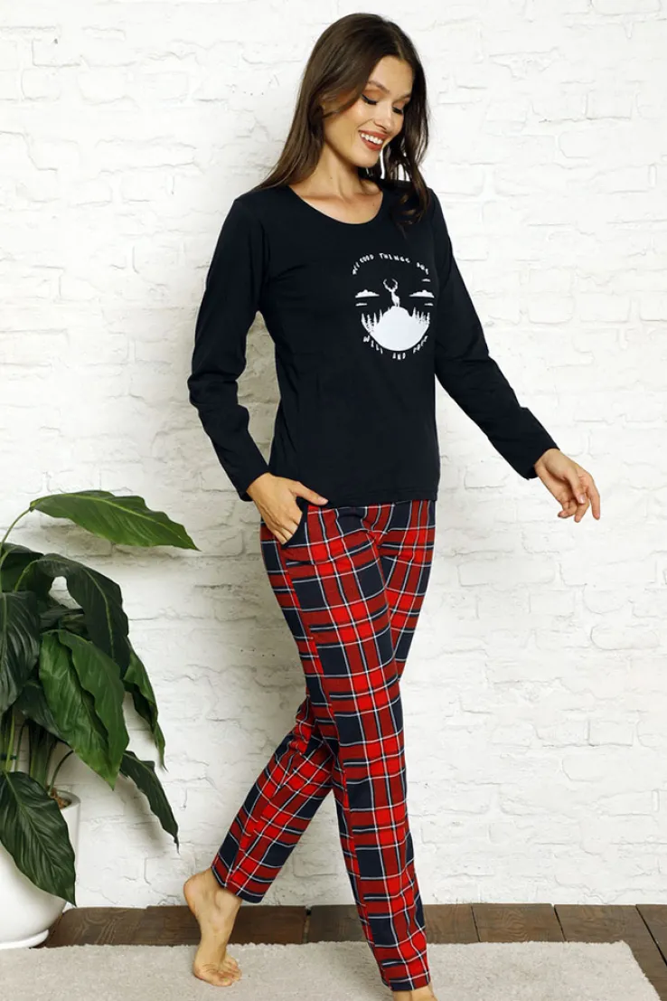 - Piżama damska wykonana z materiału bawełnianego. Model zdobiony printem, spodnie w kratkę. Idealny prezent na święta! UWAGA: Dokładność pomiaru (+/-) 1 cm.