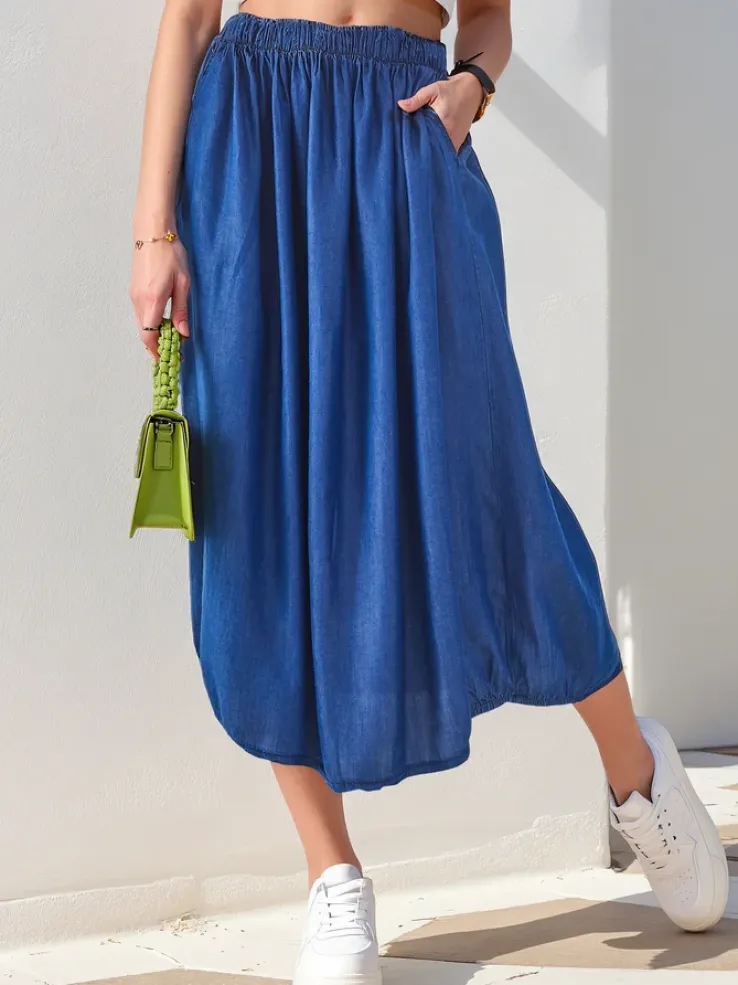 - Damska spódnica midi wykonana z miękkiej tkaniny. Model posiada 2 kieszenie. Idealna baza dla wielu wyjątkowych outfitów! UWAGA: Dokładność pomiaru (+/-) 1 cm.