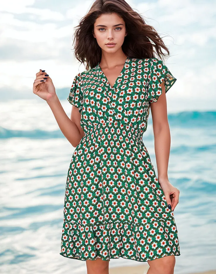 - Damska sukienka o długości mini, produkt z dekoltem w serek. Sukienka posiada krótkie rękawy, gumę w talii oraz ozdobne falbanki. Must have w szafie każdej kobiety! UWAGA: Dokładność pomiaru (+/-) 1 cm.